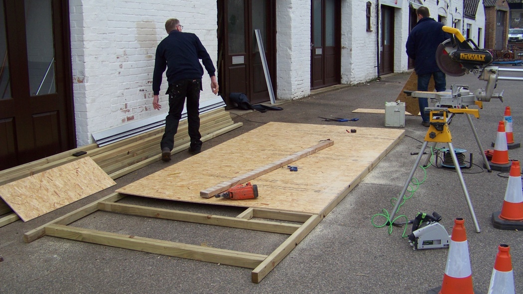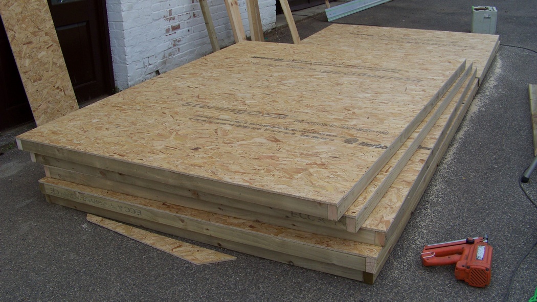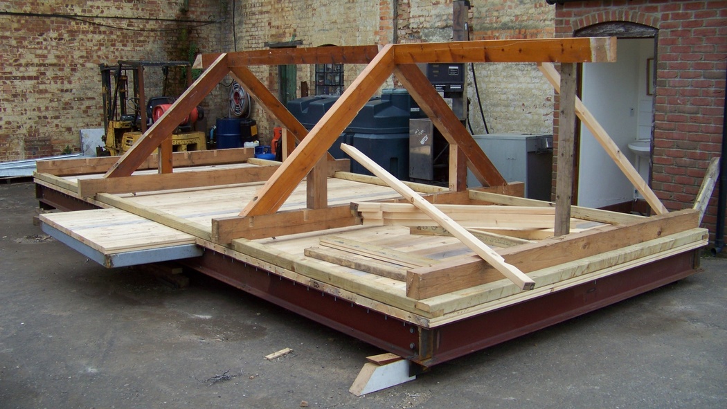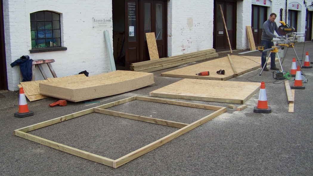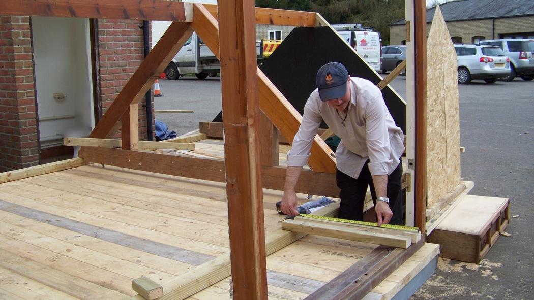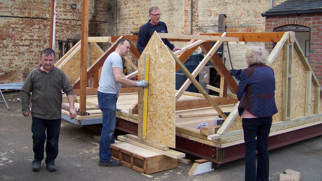 Fred had already made the steel frame and solid wood floor, he also made the roof timbers and put them on top. On Saturday 7/4/18 we made six wall panels and the gable ends. Work then started on the dormer units. When finished the parts will be taken to site and assembled.
