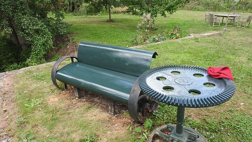 The steel bench we repaired last week was dirty and rusty so Eddie cleaned, sanded and painted it, there was just enough green Hammerite paint to finish it. We'll repaint the black parts another time.