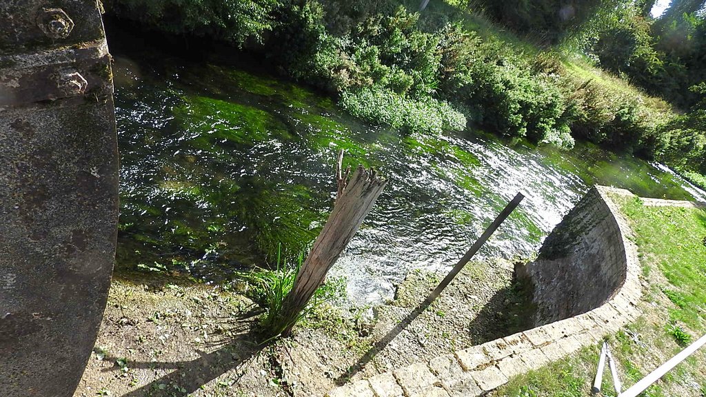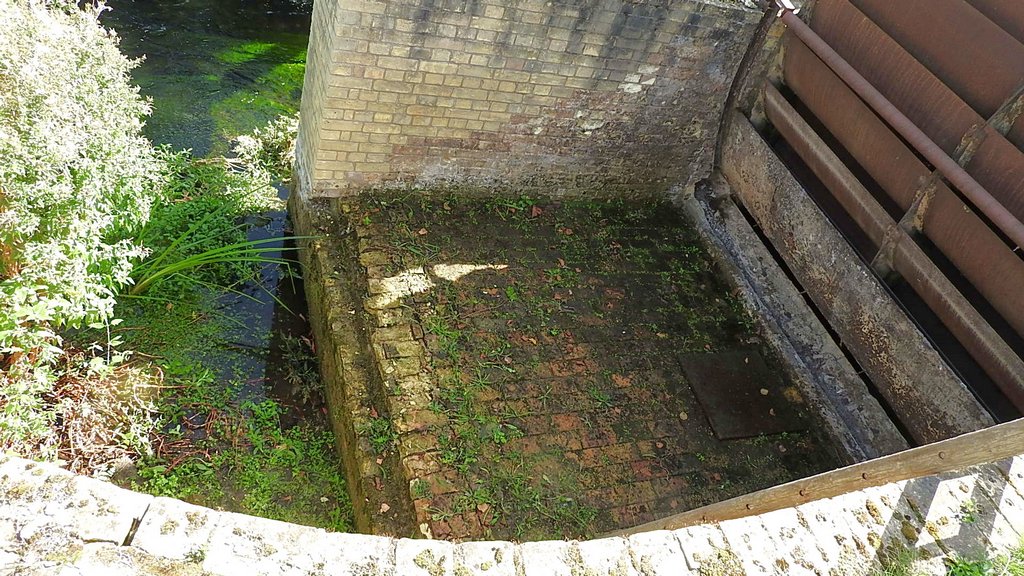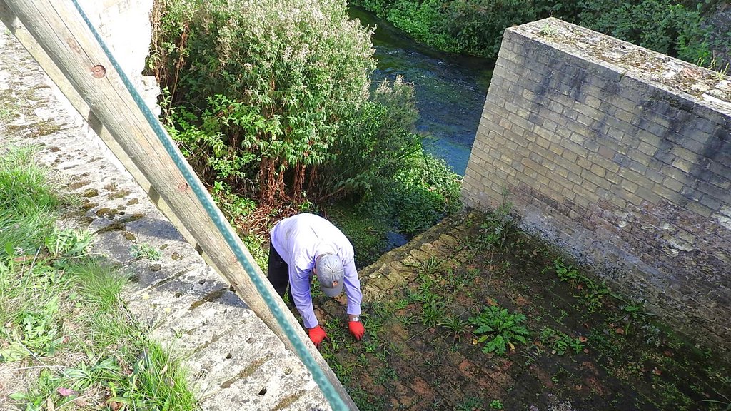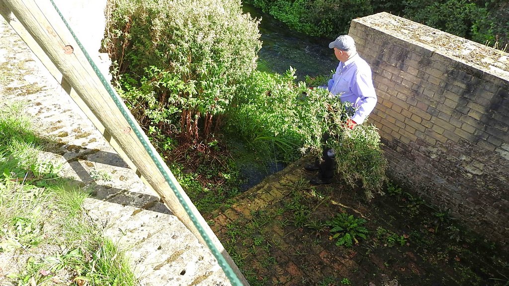 There were a lot of weeds both sides of the water wheel at river level, so I got the ladder and went down to pull them up including tall weeds in the river and on the brick floor in front of the wheel.