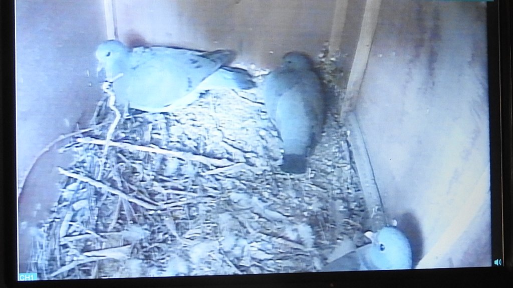 The stock dove chicks in the barn owl box were not seen today, apart from one which Eddie saw at the front of the box when he switched on the camera, we think they will fledge soon. There were red kites, a cormorant and buzzards flying overhead today.