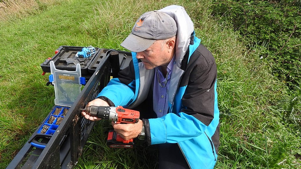 The back panel had fallen out as the frame had split apart. The top is fixed to a post in the ground, so I went back to get the sledgehammer and knocked the post in further which closed the gap allowing us to refit the panel with extra screws. It was difficult to get the bridge across as brambles had grown around it, so Eddie cut them down.