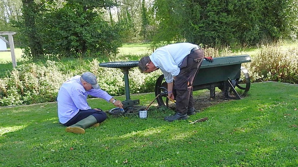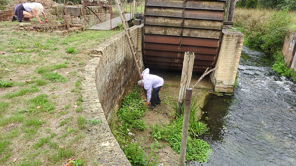 Fred also mowed the Nar Valley Way opposite the mill and cut grass between the wagon and river wall. Debra and David used petrol strimmers all around the site. Emma weeded the Hammer Mill, brick floor and Cistern and cooked fried egg rolls for our lunch which we had outside.