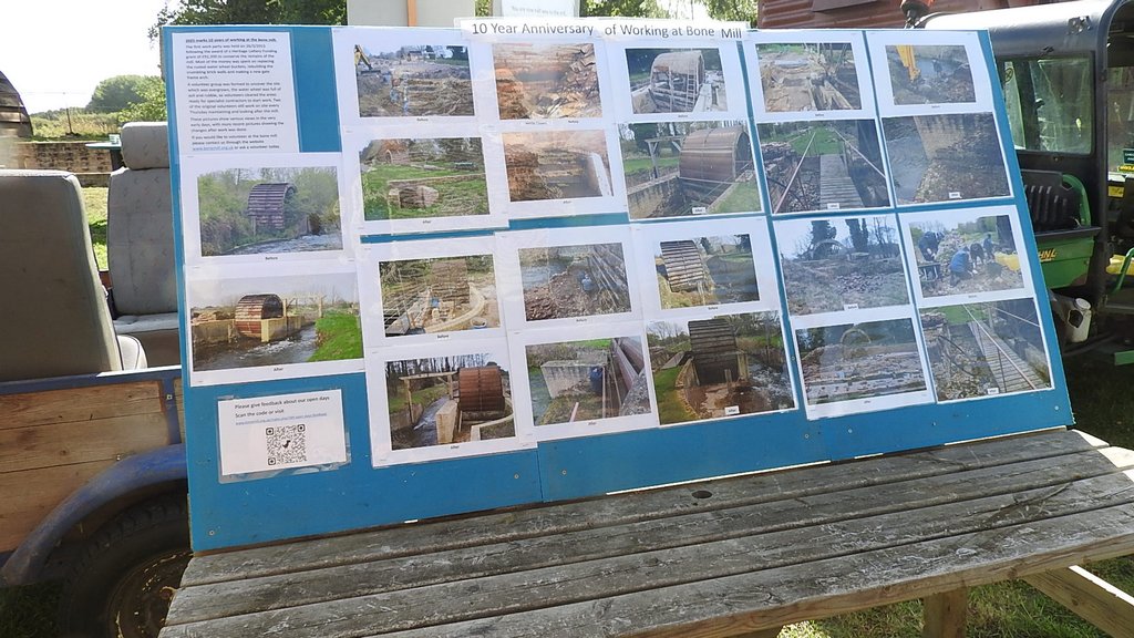 Thursday 18/9/25 I went to the mill in the afternoon and put the bridge across so Jan and Mary could cross over from their walk along the footpath to look around the mill, I put the screens on showing the water wheel turning, the model mill and meadow in flower. We had tea and biscuits outside, then Jan and Mary walked back to The Maltings, they saw a little egret and a heron.