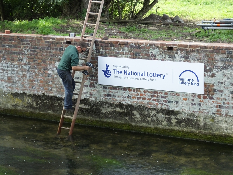 I went across to the brick pier next to the water wheel with a spade and scraped ivy off the wall, then went down the ladder into the river to clean the HLF sign on the river wall. I used our battery strimmer around the compost bay and wood store to clear nettles.