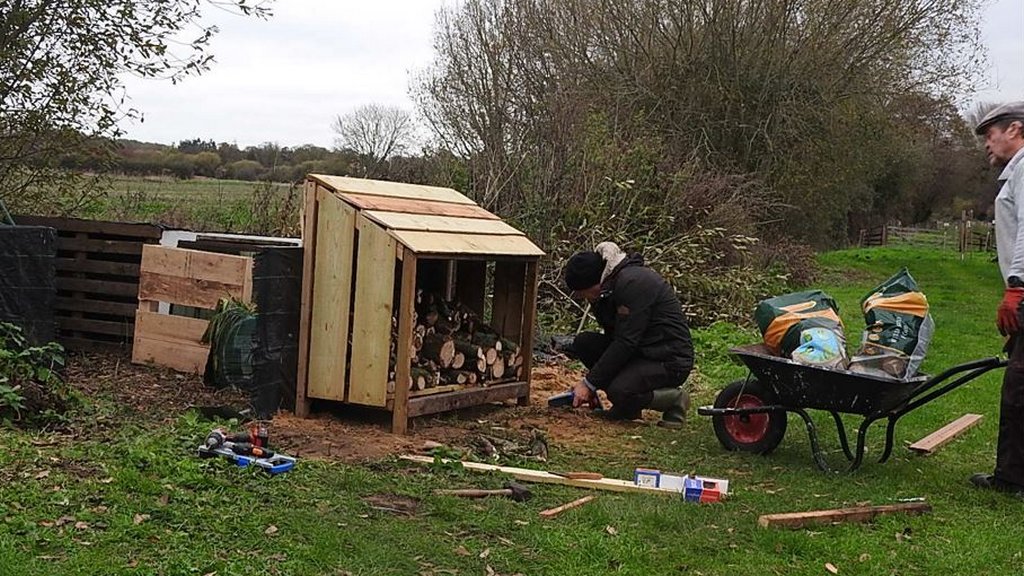 Last week I started clearing a space next to the compost bays for making a storage compound from old doors to tidy up the site, so we went over there and Eddie strimmed nettles while I pruned a tree which was in the way, Eddie took the thick branches to the logstore to be cut up for fire wood. A robin was nearby while we were working.