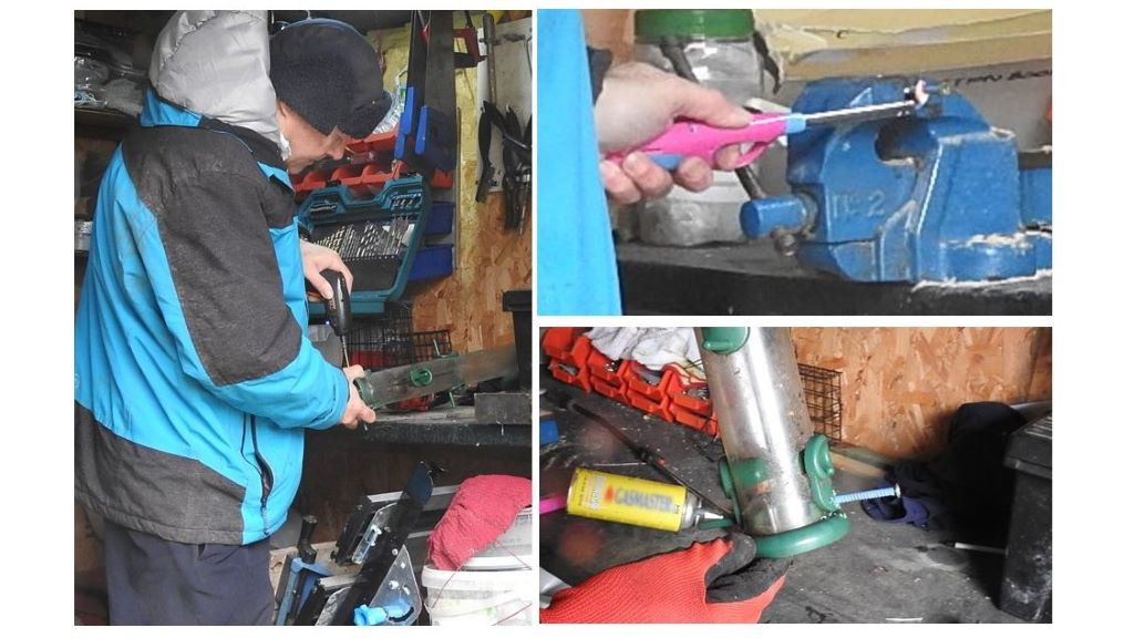 Eddie filled the bird food, we saw long tailed tits and great tits eating peanuts and suet balls. The seed feeders needed cleaning with our spray and brush. A perch snapped off one of the feeder ports as it was so cold and brittle, so I drilled a hole and fitted a screw to replace it and put heat shrink sleeving on the screw so birds feet could grip it, I used a lighter to shrink it on. We dried the feeders by the fire before refilling them.