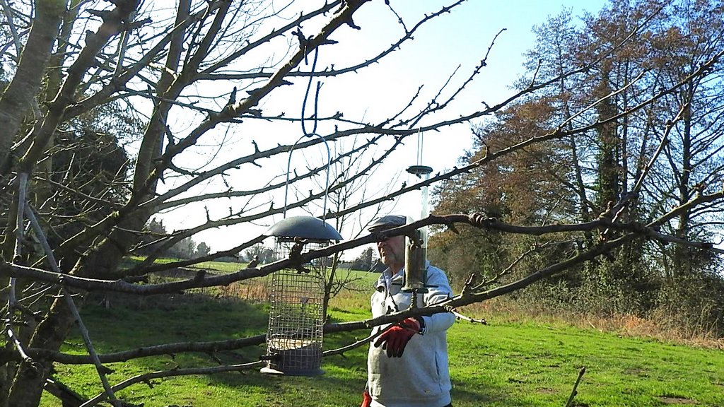 Squirrels had damaged a peanut feeder which Eddie repaired by patching the hole using thin pliers to sew it with garden wire. Eddie then filled the bird food and we saw a great tit come down for peanuts, a robin on the back of a bench and long tailed tits in the trees. I heard a lapwing calling and saw it fly down into the field behind the mill.