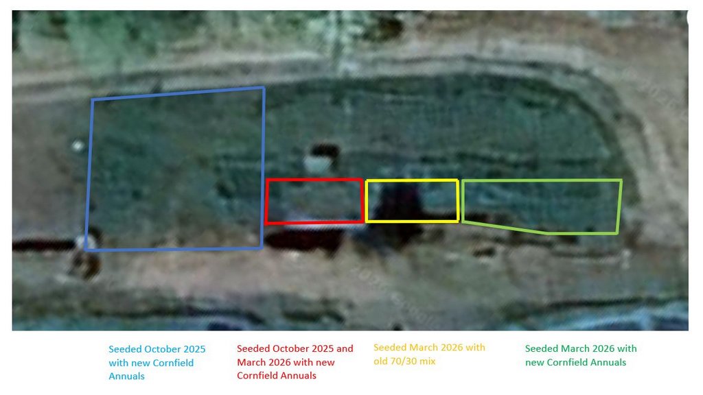 2026 Maintenance: In March we harrowed the seeded areas to encourage germination and mowed the new area next to the entrance track, harrowed and seeded it, then rolled seed in. A diagram of when and where seeds were sown will show which gives the best flowering results. We need to monitor for dry weather and water the seeded areas if necessary to avoid last season's lack of flowers.