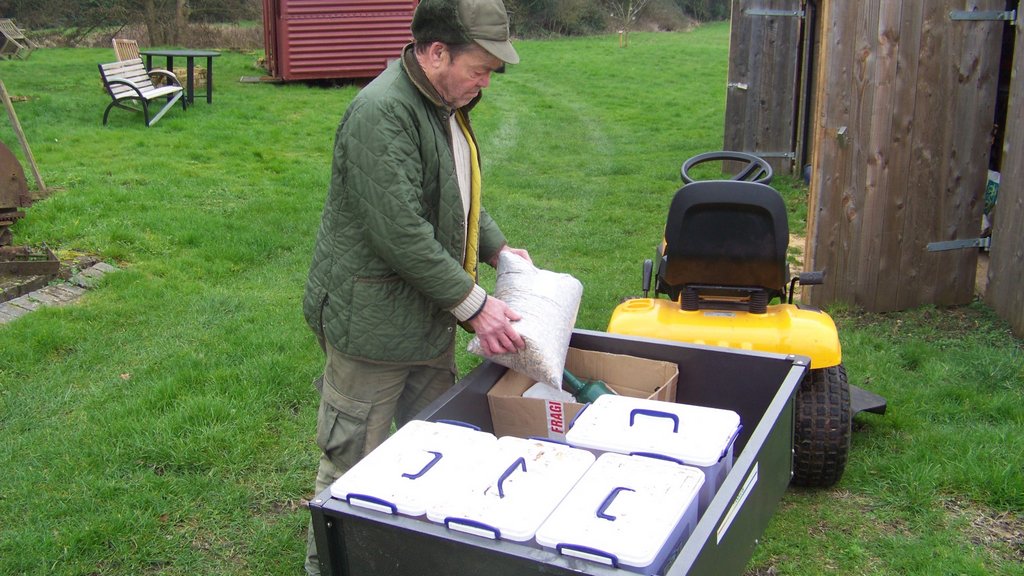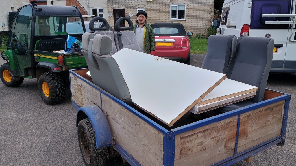 We got the Gator trailer in 2017, it was first used for work parties, setting up open days and canoe races at our barbecue. It was refurbished and had seats fitted in 2019 for transporting visitors along the riverside track from the car park to the mill on open days, as some people struggle with the walk there and back, a total of 1.5 miles. We also use it if we have big items like pallets or wood to take, or a large number of volunteers going to the mill. We used this trailer for taking all the boxes of grant funded purchases, as well as taking the picnic table and logstore. We brought back rubbish for the skip and empty boxes for recycling. We filled the trailer with a pallet and other materials for making the wildlife habitat. This trailer is also used to move large items around on site such as fallen trees and branches. We use the trailer to put car parking signs and a bench seat out for open days.