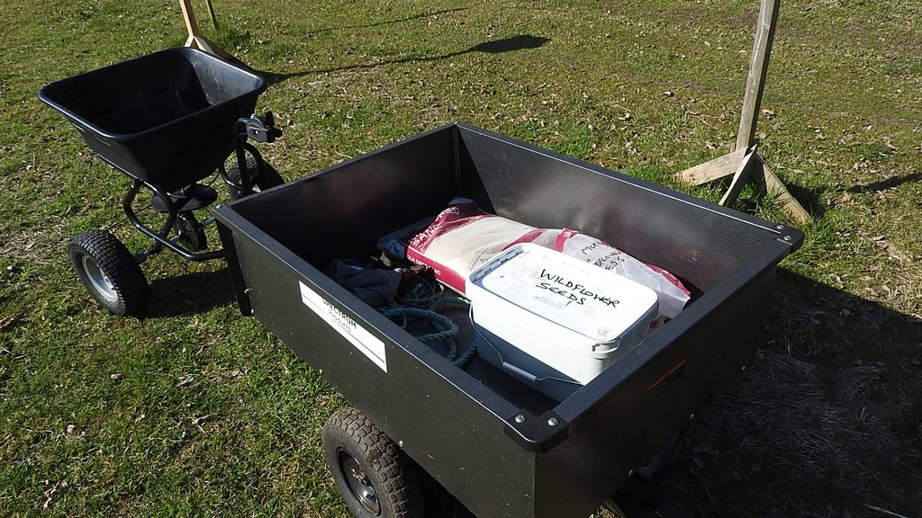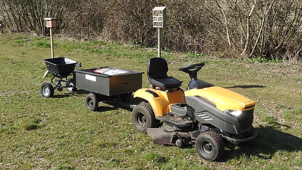 Our small tipping trailer was bought with our wildflower meadow grant in 2022, along with a seed spreader and roller for preparing, making and maintaining the meadow, they were all assembled on site. The trailer is used to take sacks of wildflower seed and sand from the shed to the meadow when sowing wildflower seeds (sand is mixed with seeds to show coverage), this is done every year. This trailer is also towed around the mill for carrying garden tools and supplies when using the mower, also for carrying bulk bird food containers to fill bird feeders around the site and for taking weeds to be tipped in the compost bay. I used it when I went to the mill on the mower with a few things and left the Gator truck behind for Eddie who joined me later. A towing hook was fitted to the back of the trailer so we can carry sacks of seed and sand around and tow the seed spreader behind it for re-seeding the meadow and grassing areas over, this was inspired by Frank who used to tow two trailers. A spacer block was made and fitted to the trailer hitch to make the trailer sit level when towed by the mower.