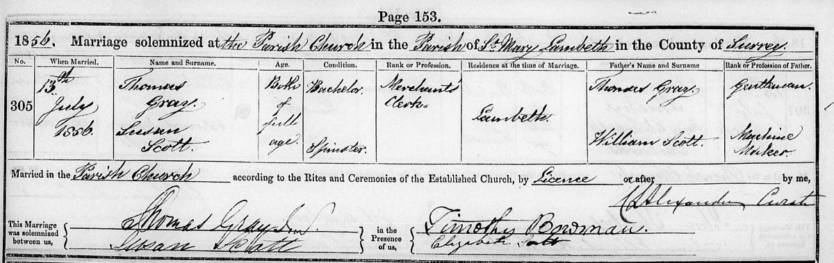 William’s sister, also a Susan, had moved to London and in 1856 married Thomas Gray in Lambeth. He was the son of Thomas Gray, a gentleman. In 1871 Susan and Thomas are living at Birchington Hall in Kent where they gave a home to Alfred and Susan.