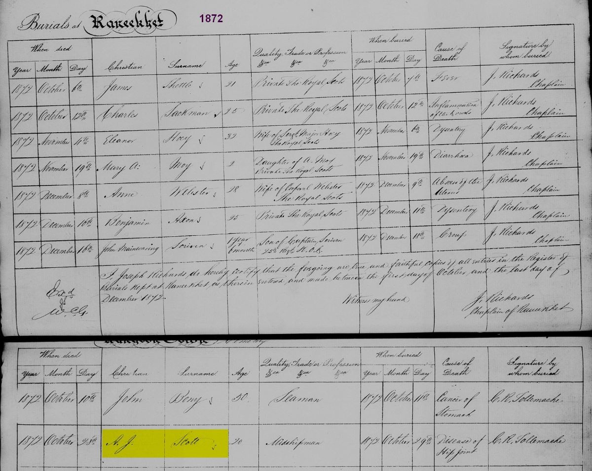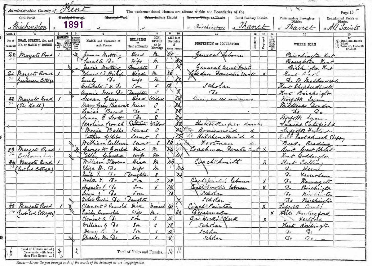 Sadly, William Scott's son Alfred only lives until 1872 as he joins the Navy but dies of Dengue Fever whilst in Burma and that is where he is buried. Daughter Susan lives with her Aunt at Birchington Hall, although for a brief spell after the death of Thomas Gray in 1879, they are all living in London but by 1891 are back at the Hall.