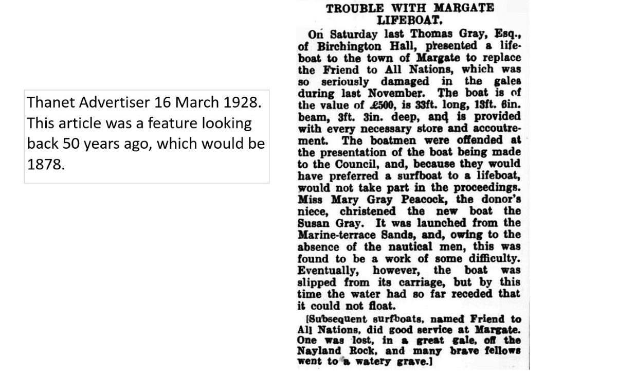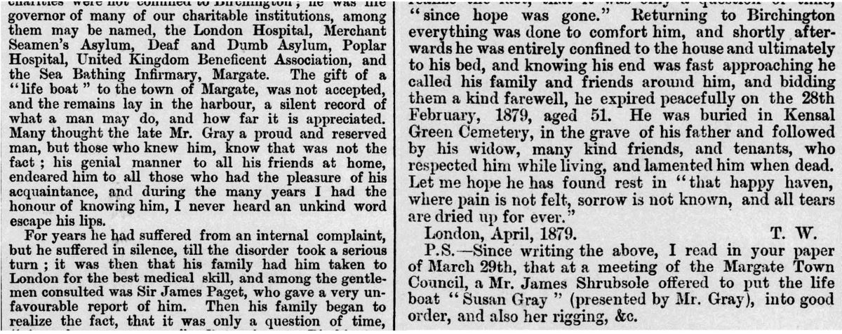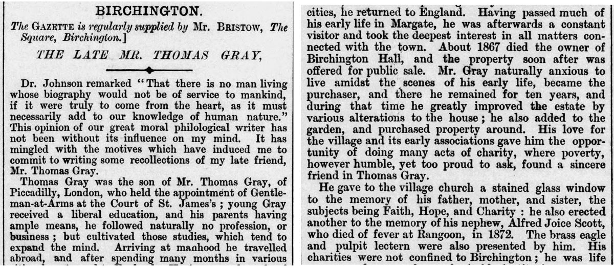 Thomas Gray was fondly remembered as a benefactor for many causes as shown in his obituary in the Birchington Gazette which also mentions that he gave stained glass windows in memory of his family to the village Church. He also gave a new lifeboat named after his wife to Margate town council.