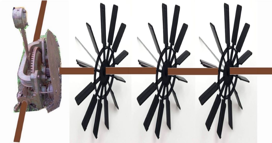A revolving shaft running the length of the floor provided power which moved the mechanism along the floor and turned the stirring blades driven from a shaft at 90 degrees to the main shaft, see diagram. When it reached either end of the building an End Stop hit the lever which can be seen at the top of the mechanism, this disengaged a dog clutch and engaged the opposite one to reverse the direction of travel. The clutches and gears can be seen in the pictures. Oil reservoir boxes and covers are intact and can also be seen.