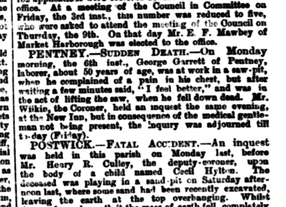 George dies in 1883 aged 52, buried at St Mary Magdelaine Church, Pentney, see picture of gravestone which is just inside the Churchyard on the left. George's death certificate states that an inquest was held and he was working as a sawyer, see death certificate and transcript. A newspaper report gives details of what happened at his death, see image of article.