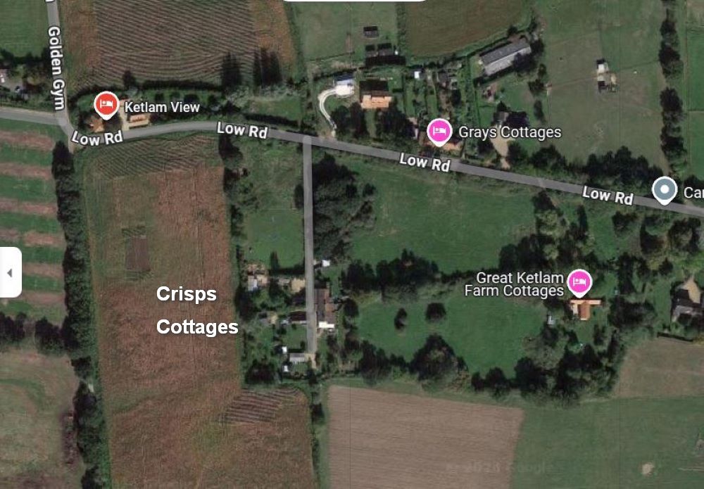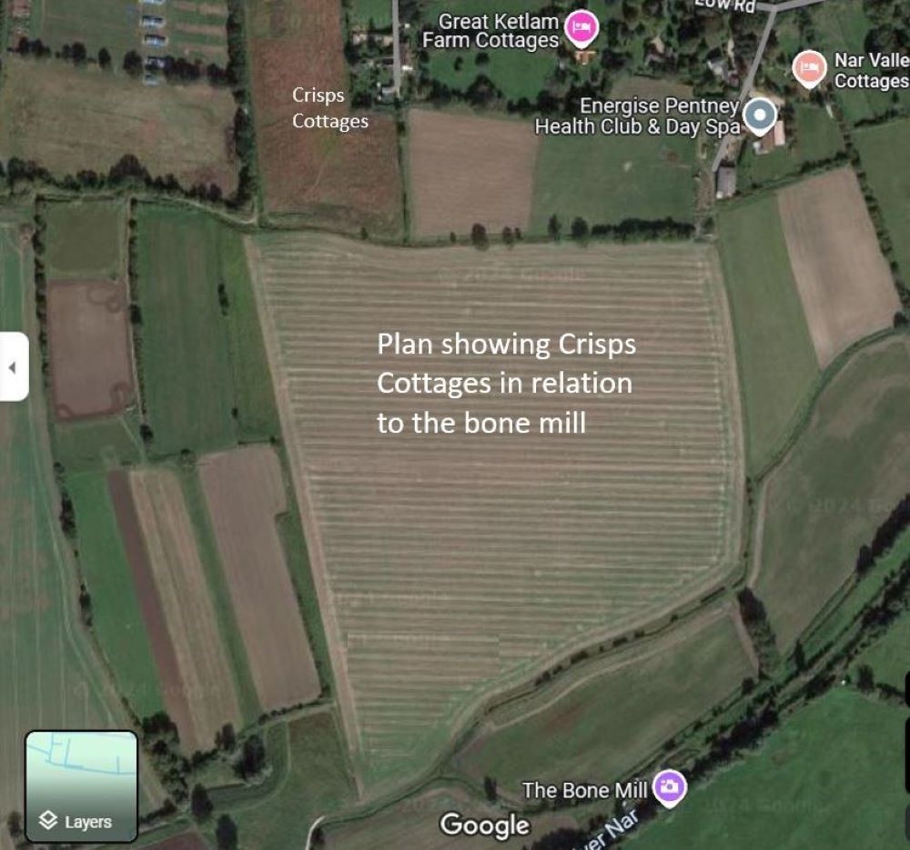 The map below shows that Crisps Cottages, off Low Road (pictures below) is only two fields from the bone mill, so George probably walked to work over the fields.