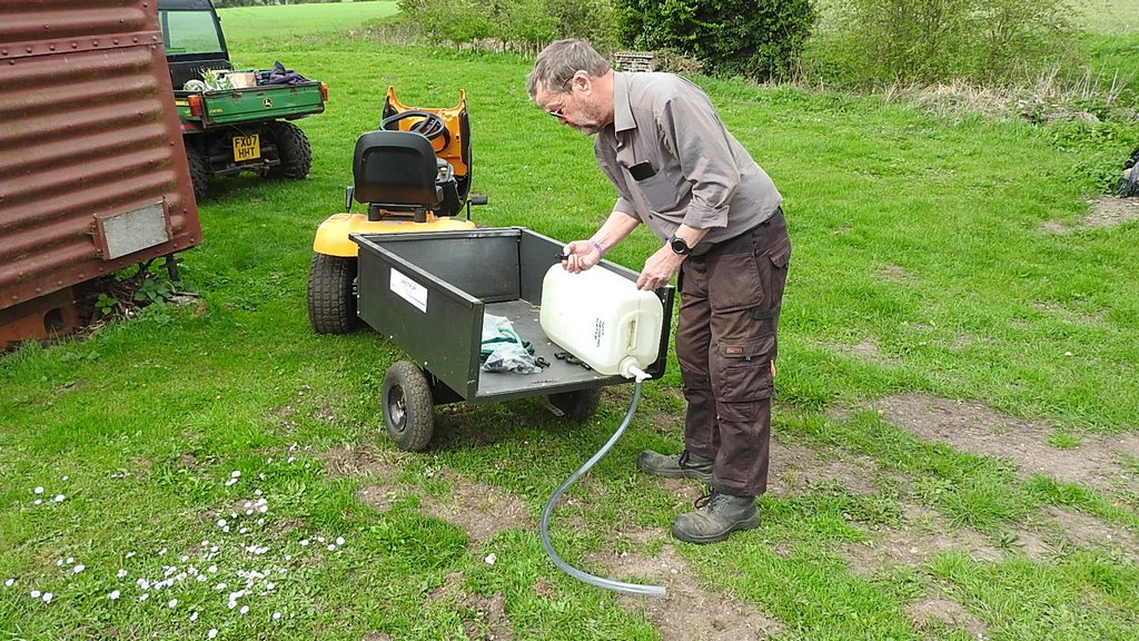 Thursday 9/4/26 Last year we had the driest spring on record resulting in hardly any wildflowers due to lack of water, so today we took the mower and trailer, a length of hose and a bag of fittings to make a sprayer boom using our water tank.