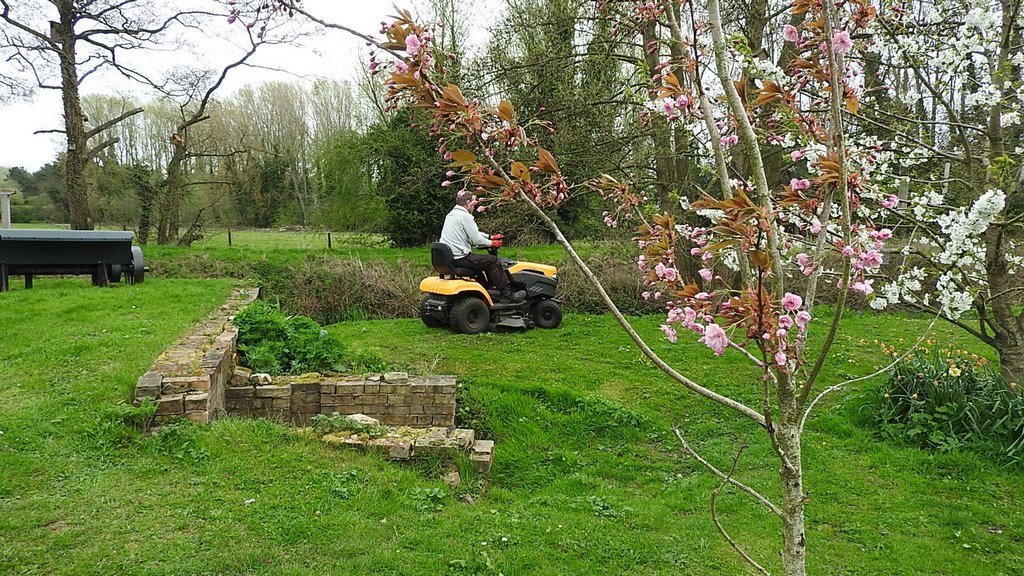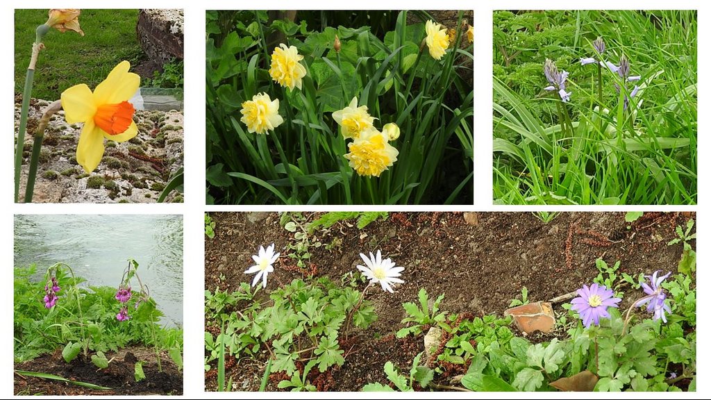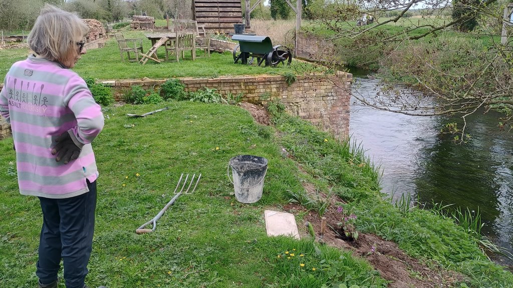 Anne Marie walked from Pentney and planted honesty from her garden on the river bank and dwarf tulips from the market around a tree, then watered them all. There are anemones and bluebells in flower on the river bank, ruffled daffodils around the cherry tree and one remaining daffodil in the grindstone.