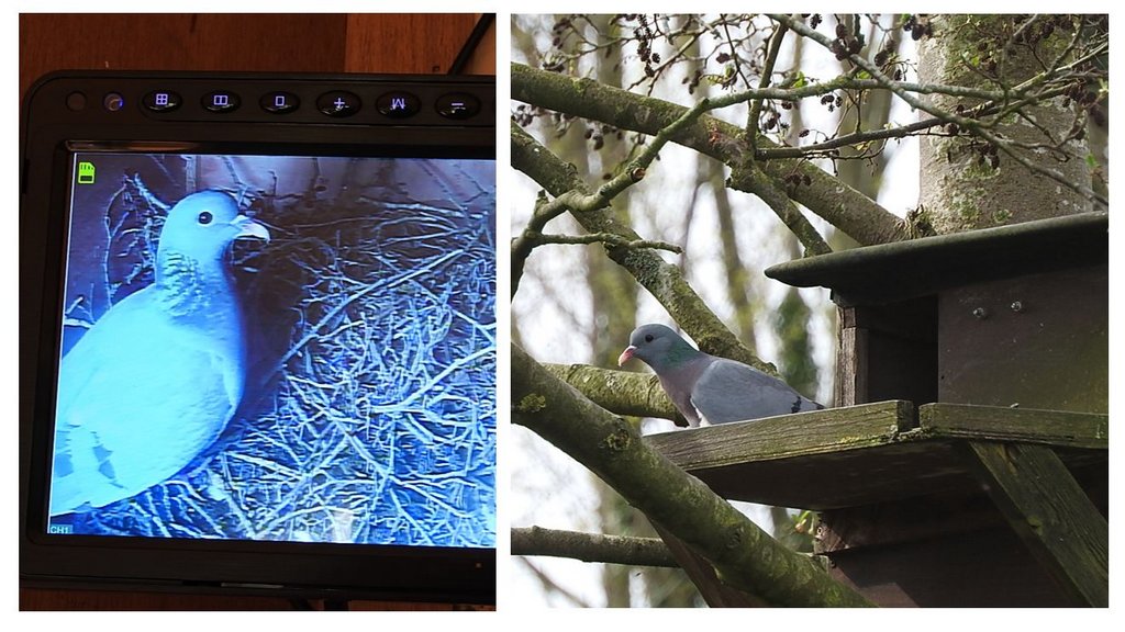 We switched on the camera screen and saw a stock dove in the barn owl box, we also saw it on the ledge outside the box and we heard it calling. A great tit was adding nesting material to its box. Other birds seen today were goldfinches on the grindstone, pied wagtail and a robin. I filled the bird food and water while Eddie cut all the grass.