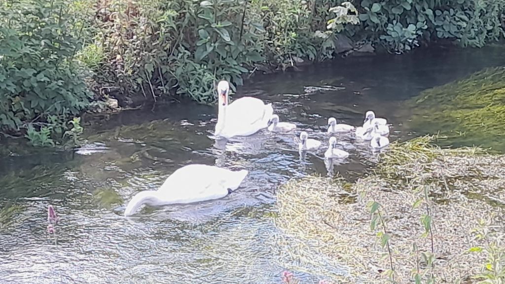 The male swan was in the river and the female was moving her three eggs around in the nest, they do this to regulate the temperature. Swans lay upto nine eggs over several days so there may be more to come, in 2024 we saw eight cygnets.