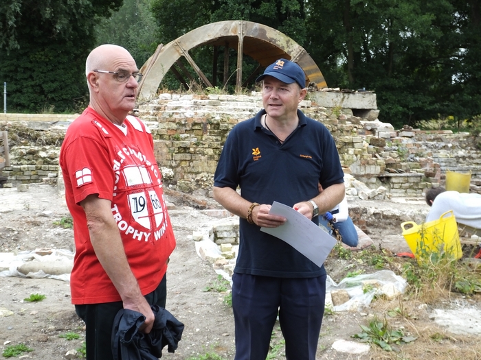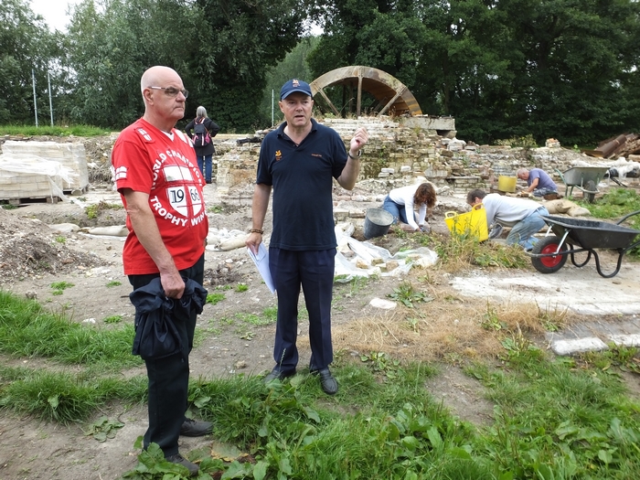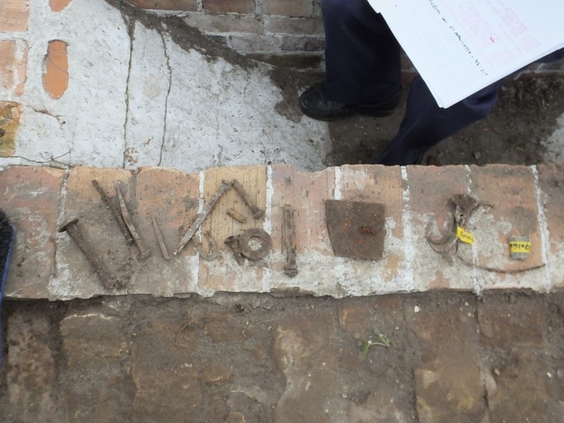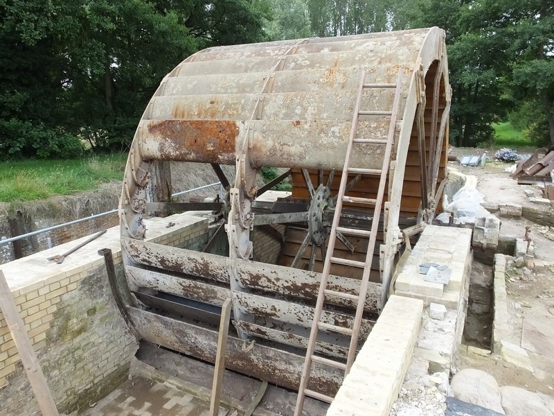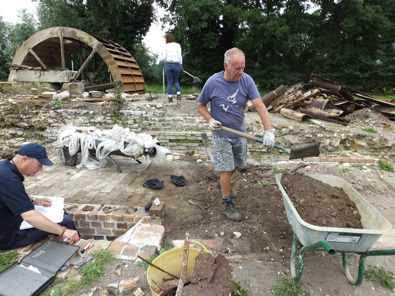 The water wheel only needs 4 more metal troughs replaced before it is complete. Pictures were taken so we can have a gallery on the website showing the progress of the refurbishment. The wheel appears to have turned nearly a full revolution. The days finds were metal plates, bolts, nails, wire with a bell shaped tag, as well as the bones and material at the bottom of the small trench. These were all recorded, and also some of the backlog from previous digs.