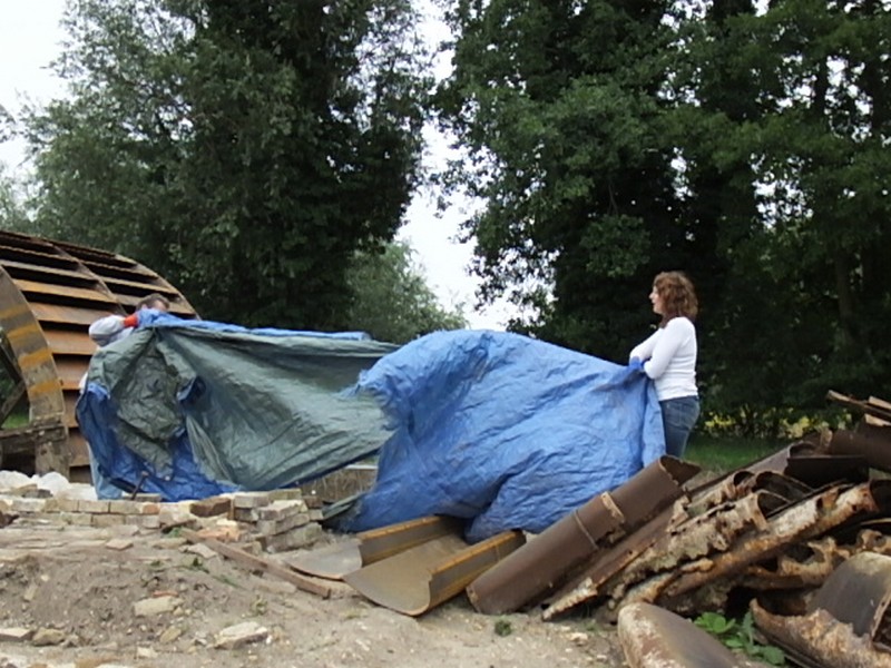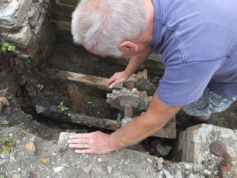 The elevator mechanism near the wheel which we assumed was bolted down was found to be loose. The chute was cracked right through so this was marked up and removed, water was drained from the metal trough under the chain wheel and the pit was dug out. Then it was covered with a tarpaulin held in place by bricks to keep the feature dry.