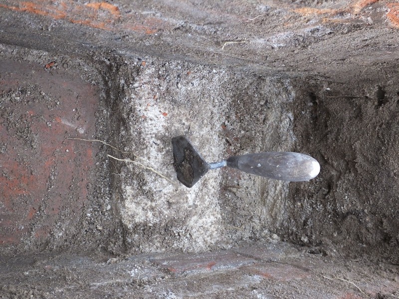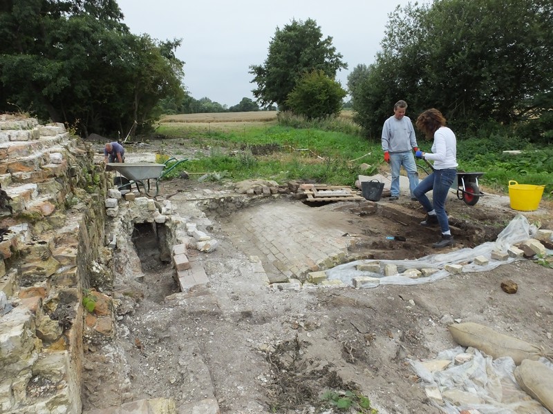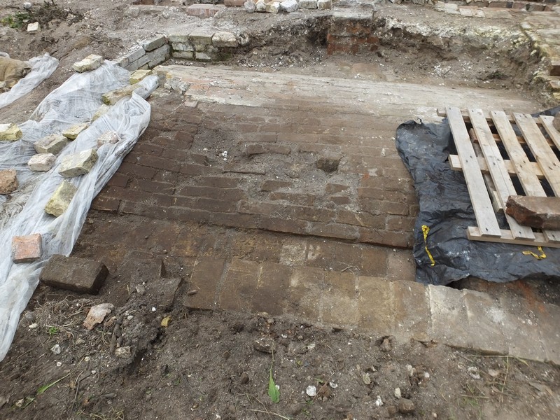 The curved trench running into the main trench was completely dug out and the coping stones were laid on top, with rows of bricks at the sides to discourage anyone from walking on it.