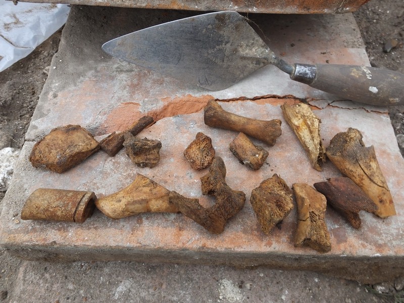 What we had assumed was a path running from the sloping trench to the furnace area turned out to be a small covered trench about 40cm deep, filled with earth with a 5cm layer of white powdery substance at the bottom, of which a sample has been kept. A section at each end was dug out, it has now been re-covered. There were a large number of bones from this dig, some of which appear to have been cut on a bandsaw.