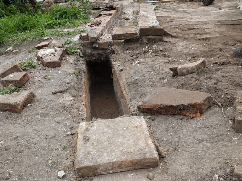 There were 5 volunteers working today. We continued to excavate the rest of the cistern top, removing vegetation and earth and exposed the whole curved top. We made the hatch waterproof by levelling up the surround with bricks and put a tarpaulin on top to prevent further water ingress as heavy rain is forecast tonight.