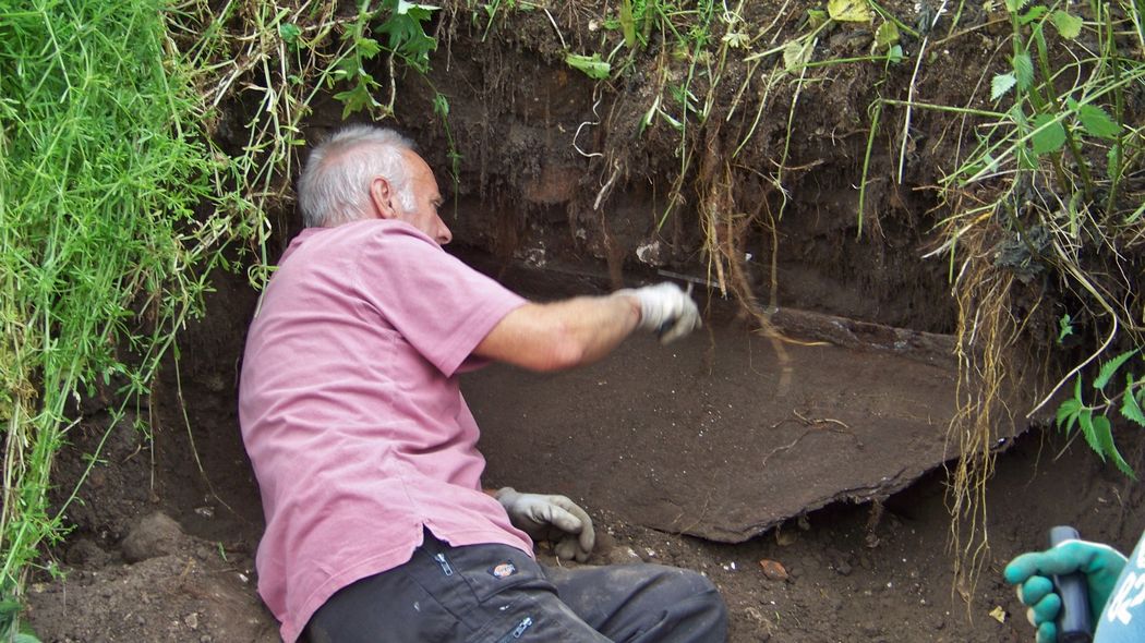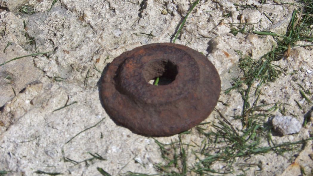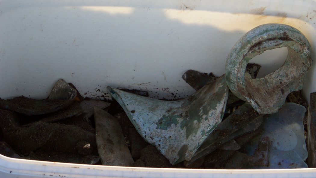 Finds include large glass jar fragments, a small iron flange, and a very large metal plate was uncovered near the blacksmith area.