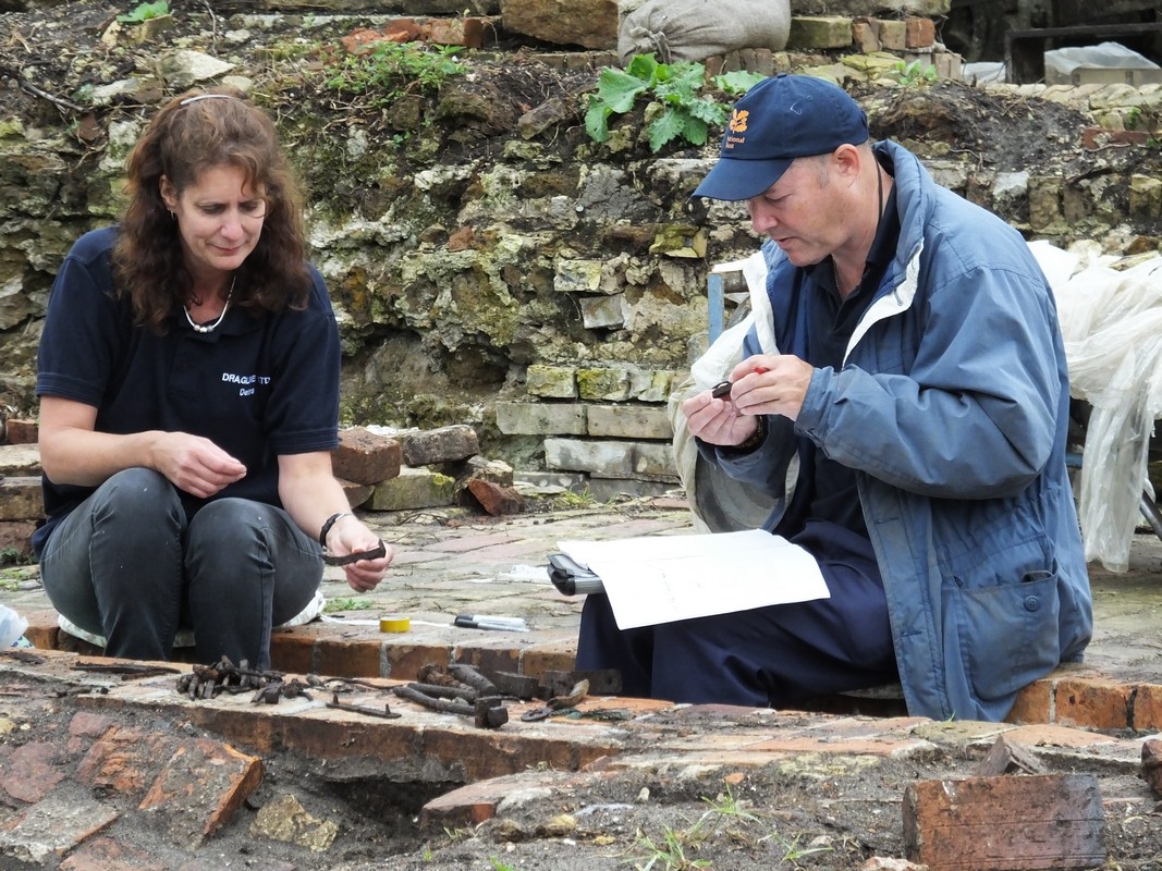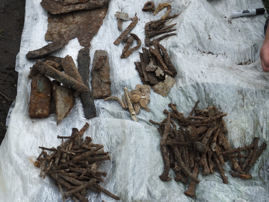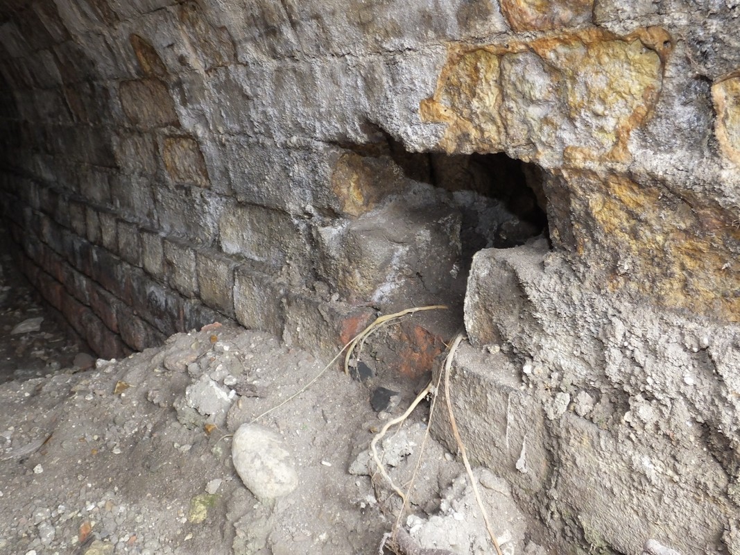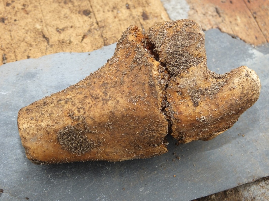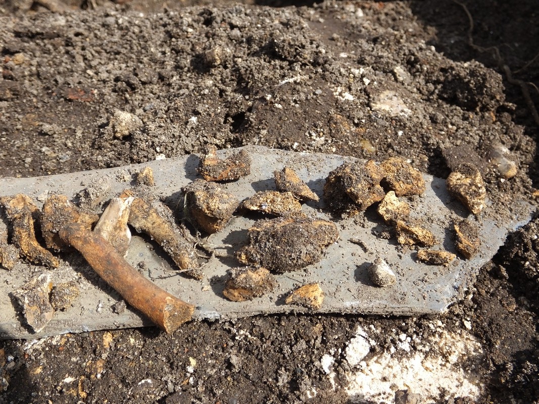 6 volunteers were on site today. Tasks included sorting and recording the remaining finds, this has now been completed. The area near the furnace was excavated and the trenches leading into the tunnel were exposed. Lots of bone fragments were found in this area by Adam, Dennis’ Grandson who was helping us today. The outside tunnel wall has been revealed along most of its length. A window stay, metal strap, large bolt, knuckle bone and some teeth were also found in this area.