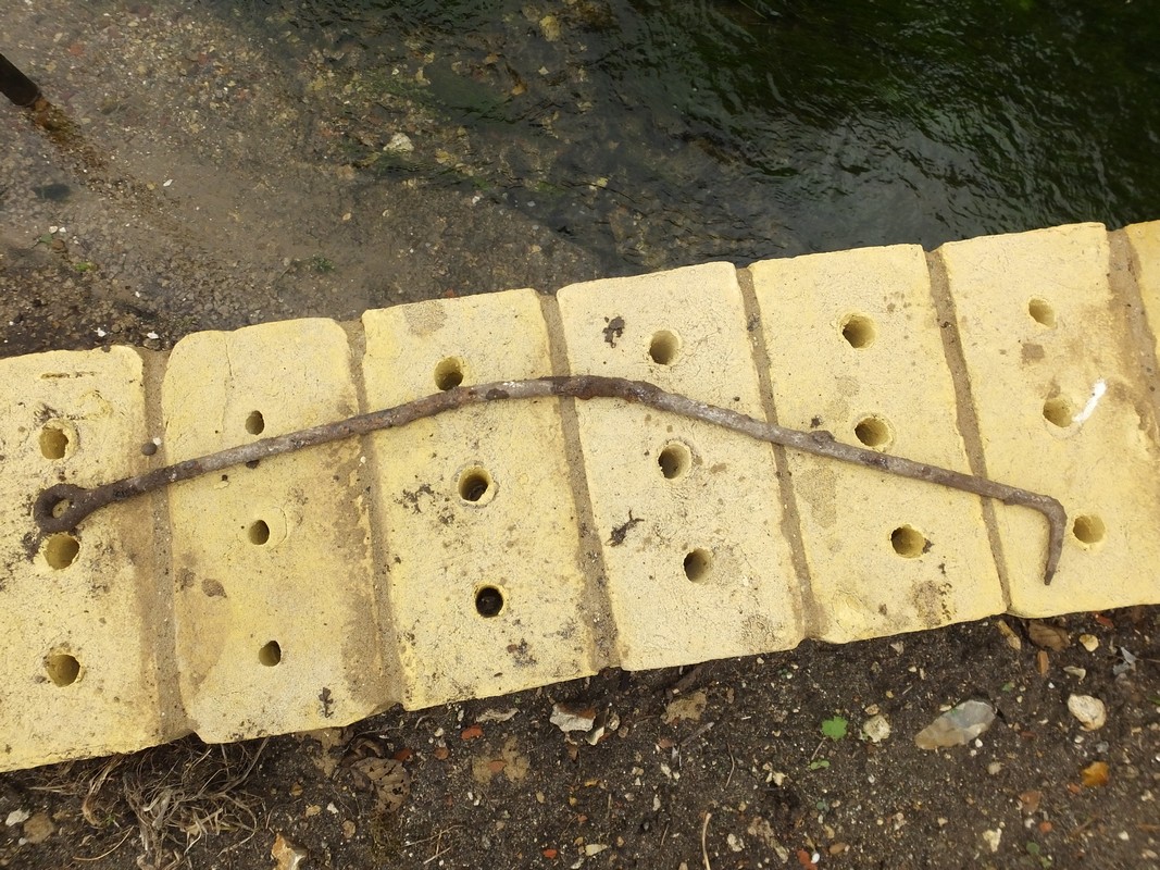 Markings were noticed on the original part of the brick wall on the down stream side of the wheel, an upward arrow carved into a brick and the letters HW which we assume to mean High Water as the mark is about 40cm from the top of the lowest part of the wall.