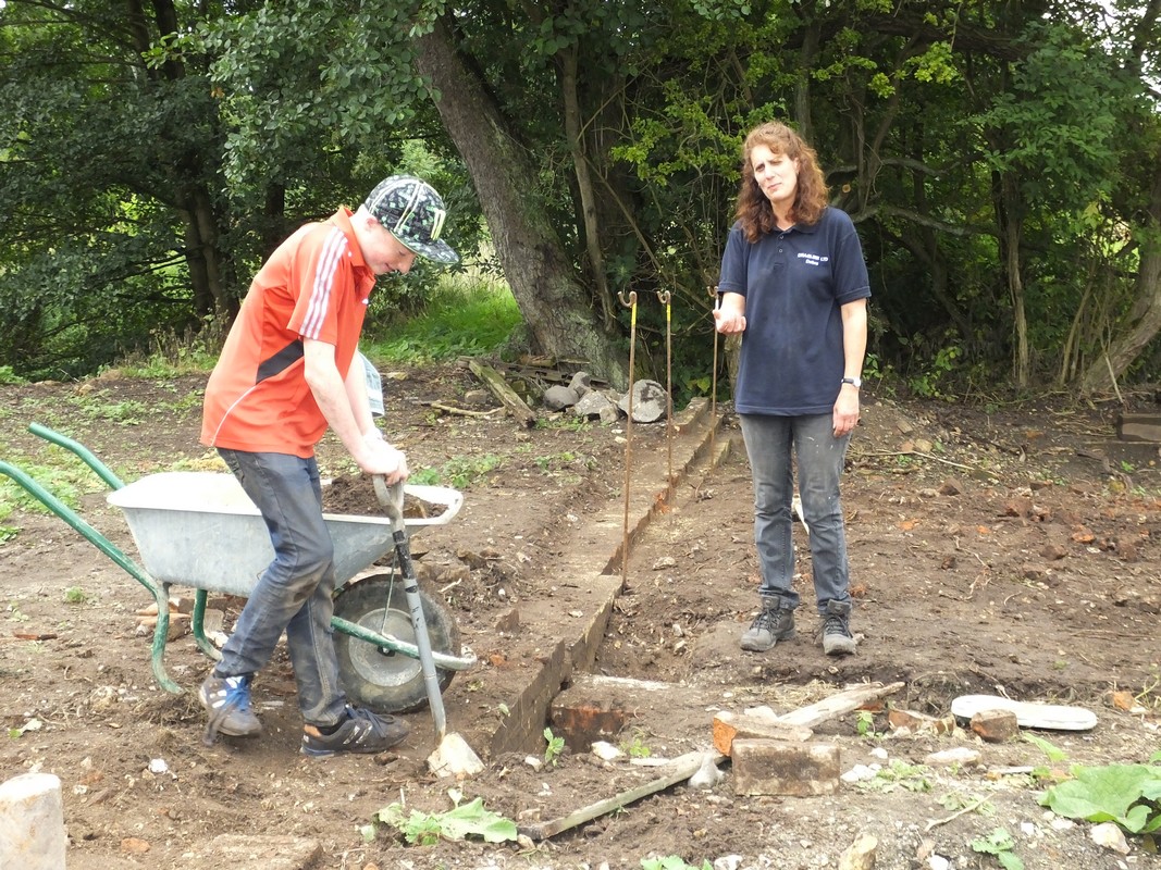 The path trench was opened again and samples taken of the material at the bottom which was subjected to an experiment to see if it contained fat. A small amount was put in a tin and heated with a lighter to see if it would melt. It did not melt so it is assumed to be bonemeal. Samples have been kept and labelled. What appears to be a small elevator bucket was found in this area.