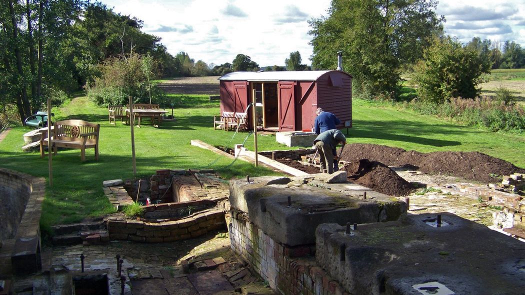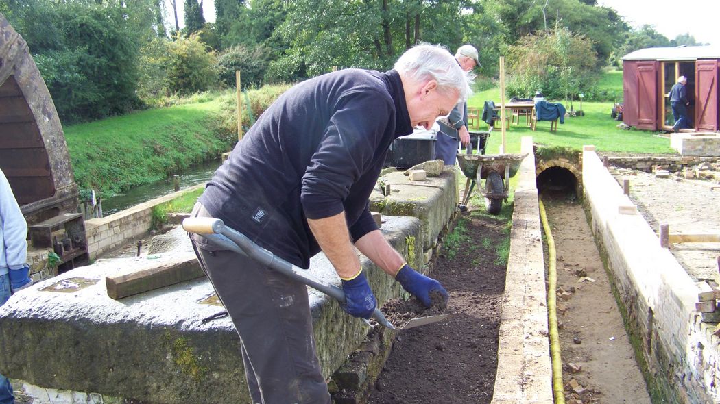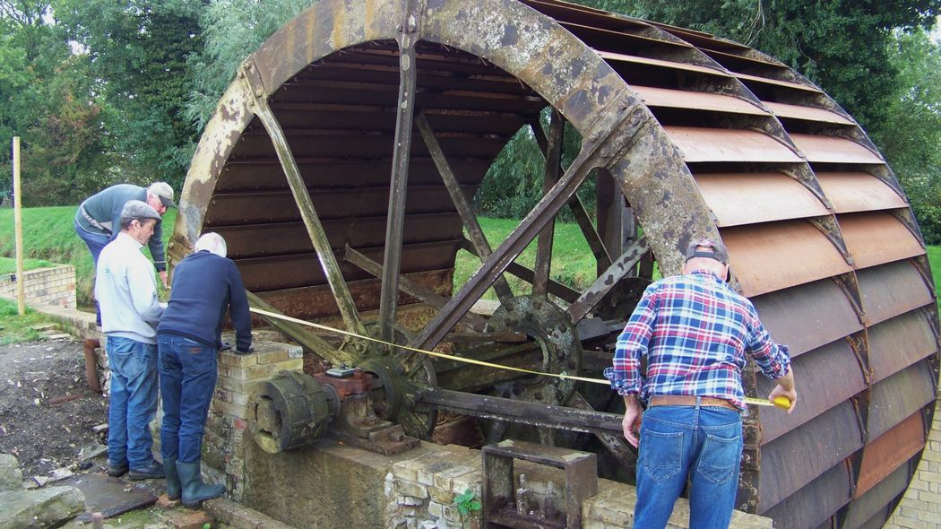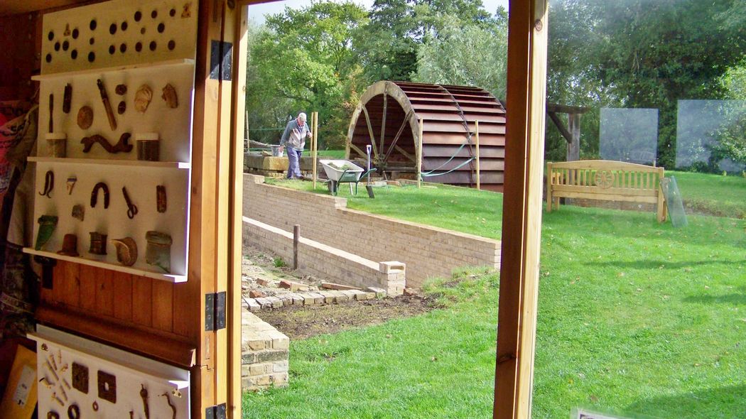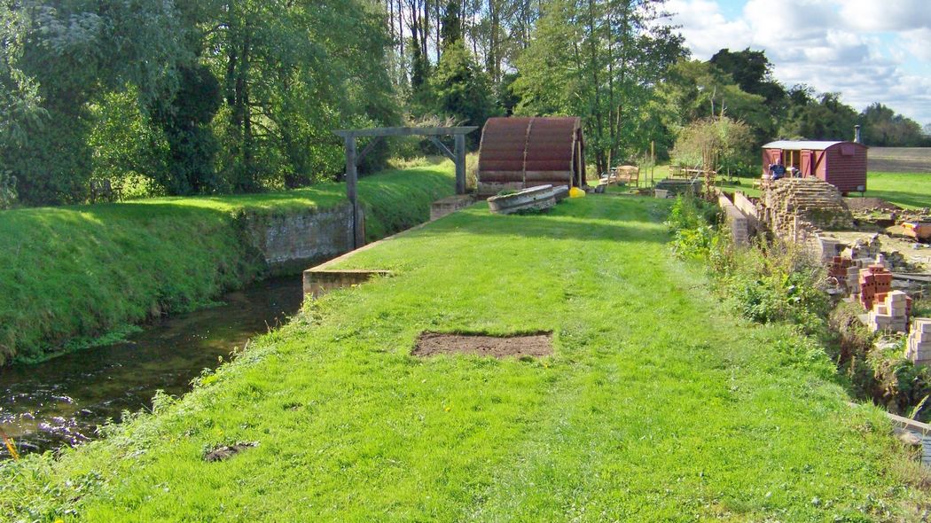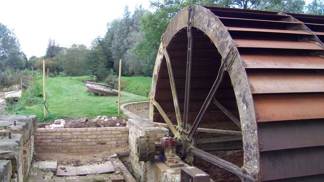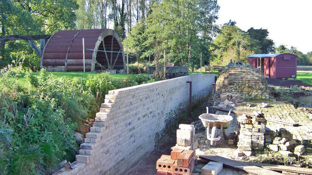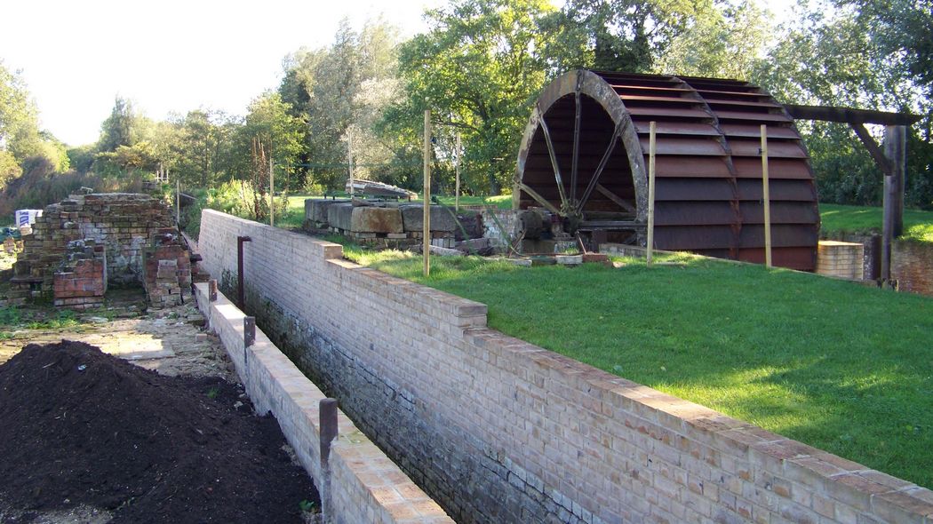 A retaining wall, known as The Great Wall Of Narborough was built to hide the water feed pipe which turns the wheel. Soil will be built up behind the wall and grassed over, level with surrounding areas.