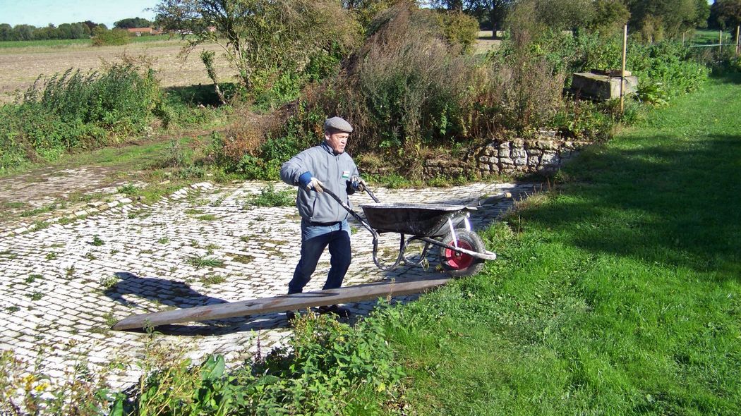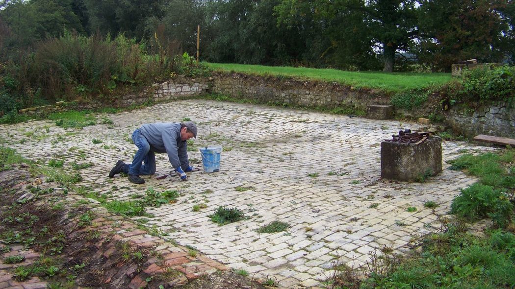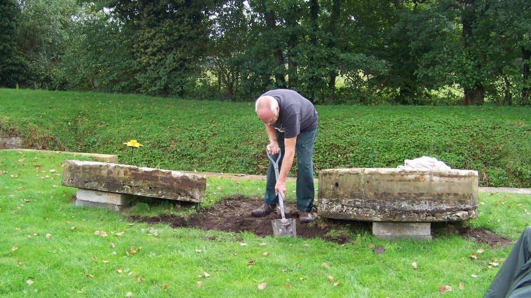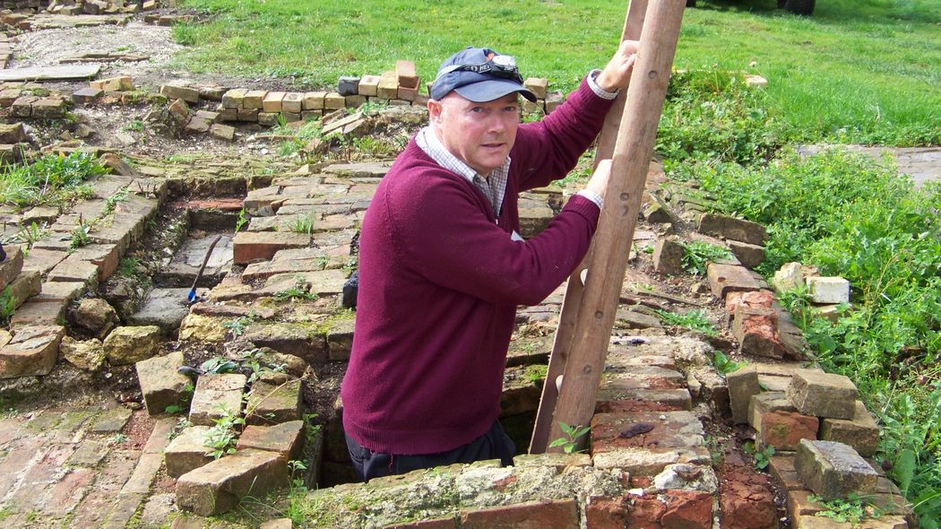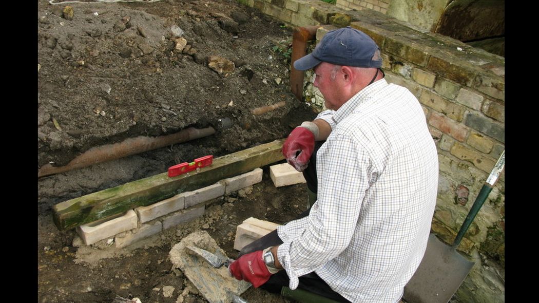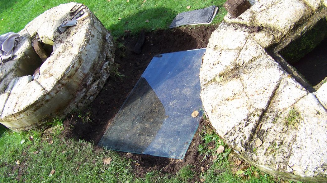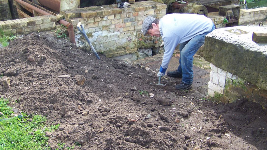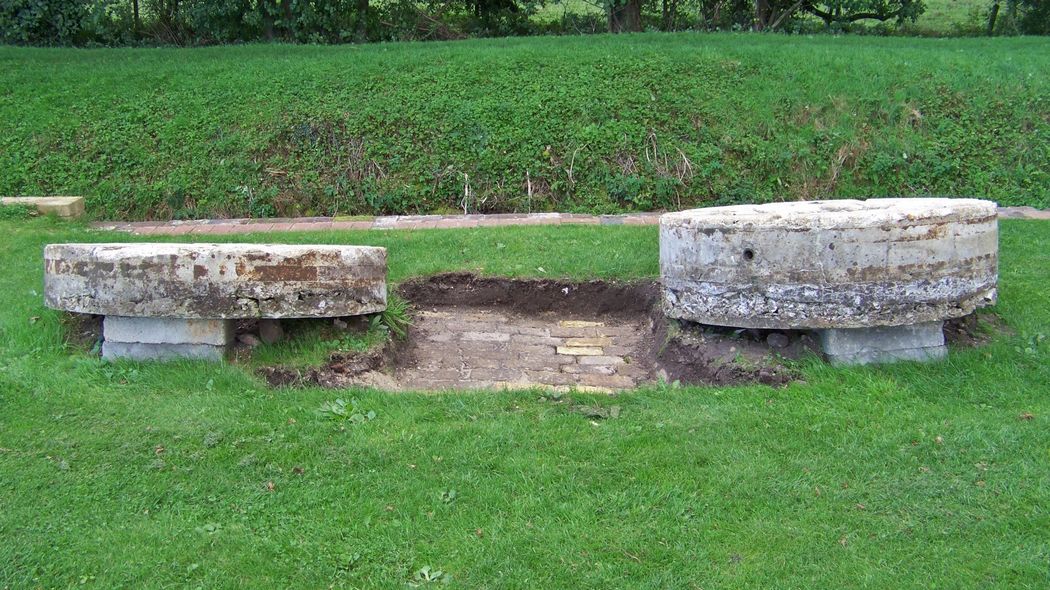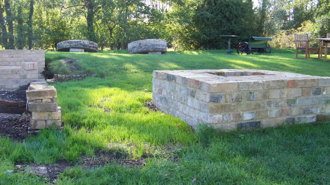 An area of grass between the grindstones was dug out to expose the brick floor, this will be covered with a piece of framed thick glass for viewing.