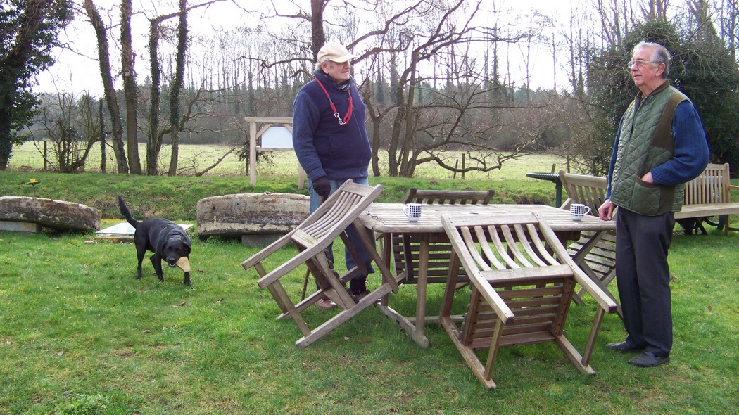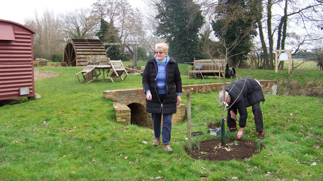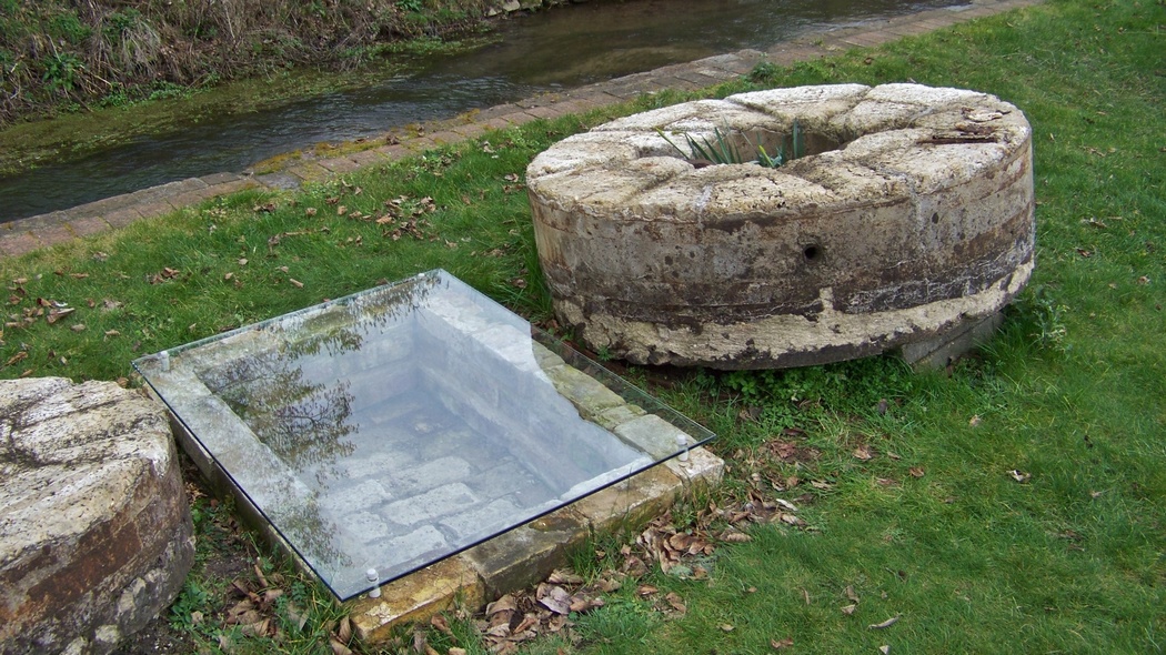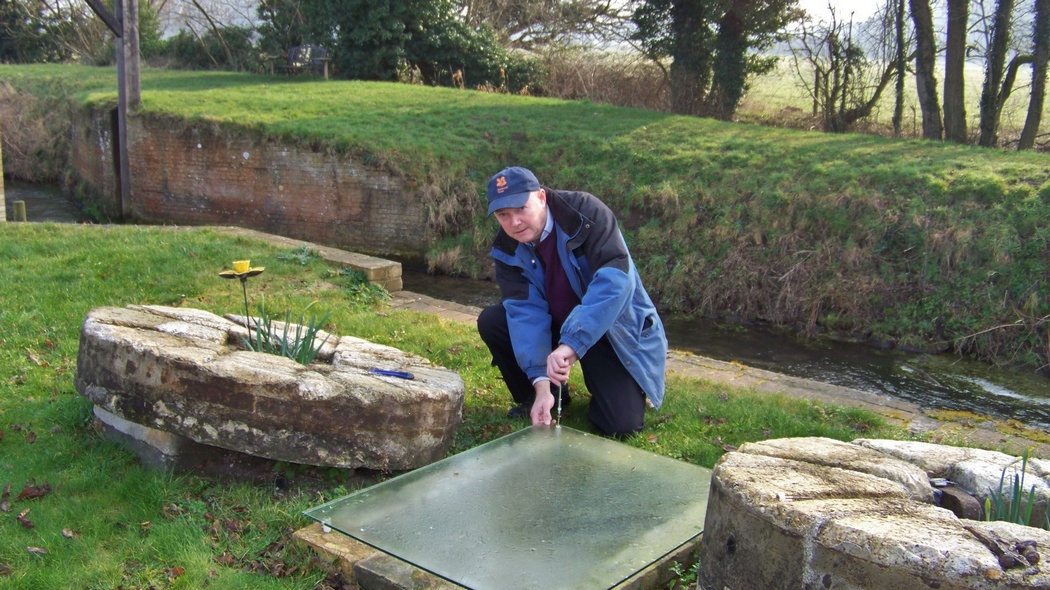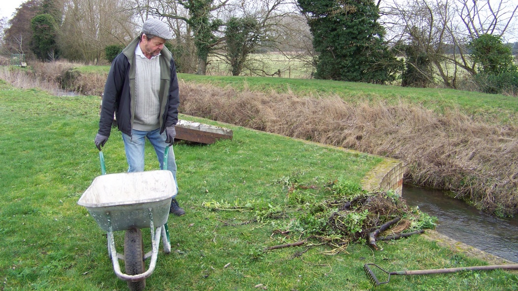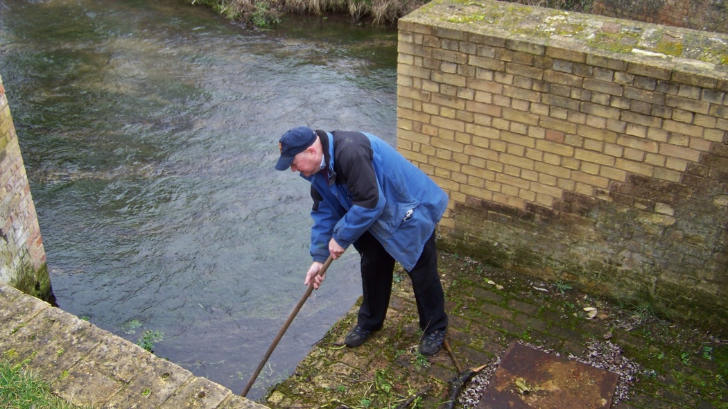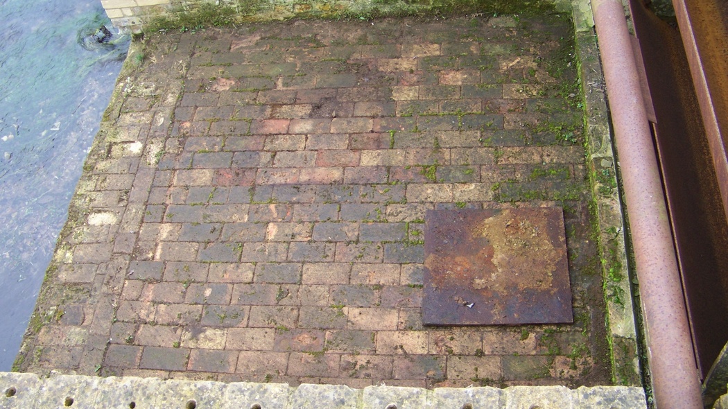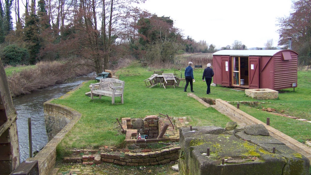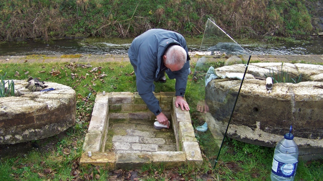 We cleared loose weeds from the river in front of the water wheel and swept the brick floor below the wheel. Bulbs and Aconites were planted in the garden. The glass covering the exposed area of brick floor was removed and cleaned, the bricks were cleaned and swept of leaves.