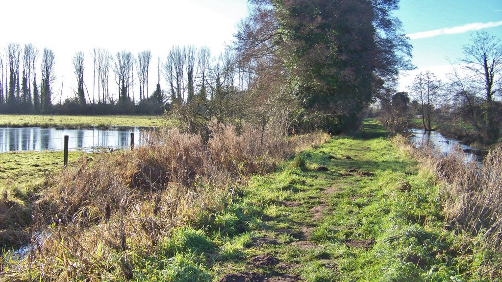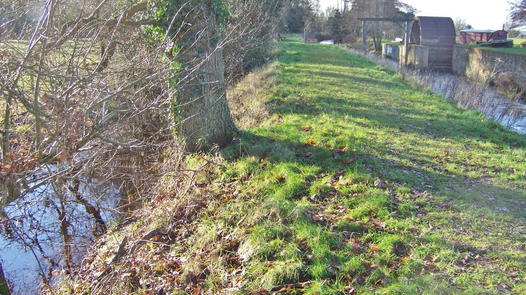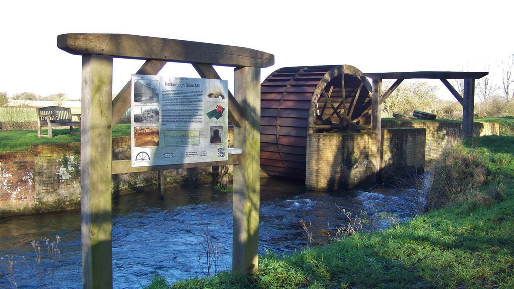 On 2/1/21 I had a walk along the Nar Valley Way footpath on the opposite bank past the mill, so I took a few pictures and cleaned the information board. The river flooded on Boxing Day and is still quite high, the fields opposite the mill are flooded and the drain is very full making the footpath wet and muddy in many places.