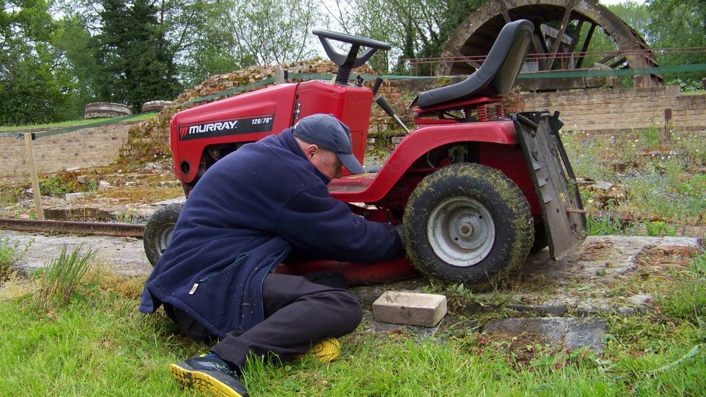 In the past two weeks we repaired the cutter height adjustment on the mower and cut all the grass on site, we also started to cut the grass along the track. We raised the seat of the green bench as it was sloping which made it uncomfortable, so we cut blocks of wood and fitted them under the front and painted them black to blend in. The glass panel showing the brick floor was cleaned as it was covered in dried grass cuttings.