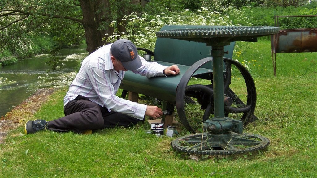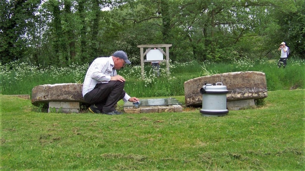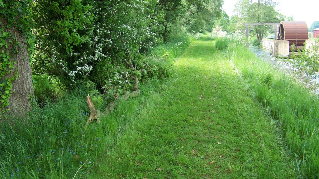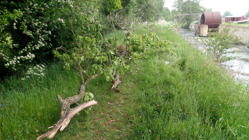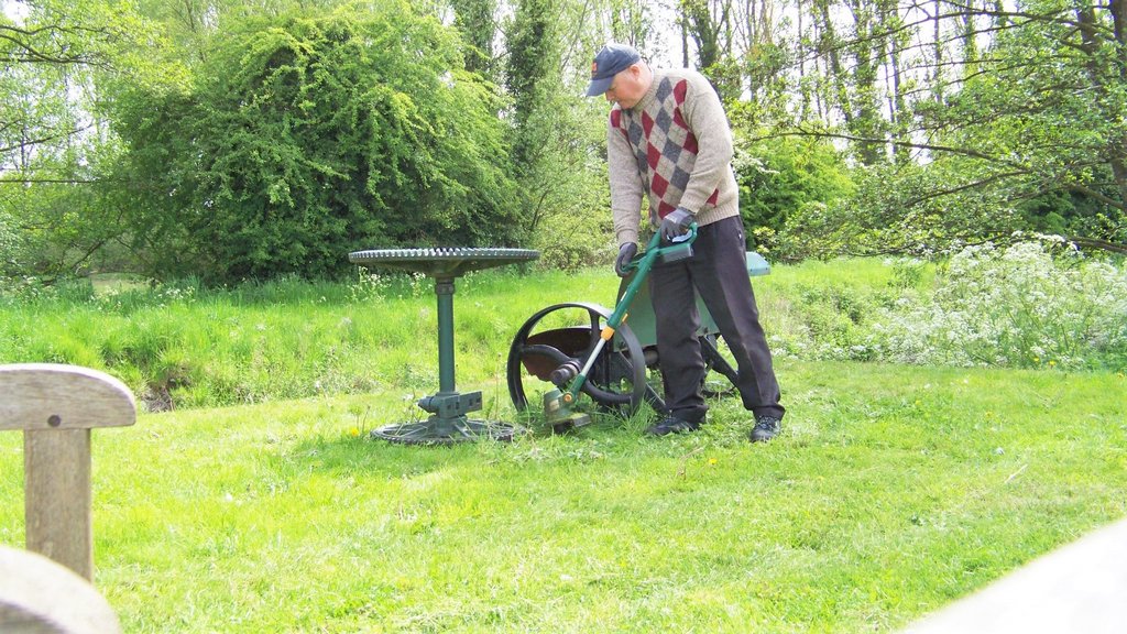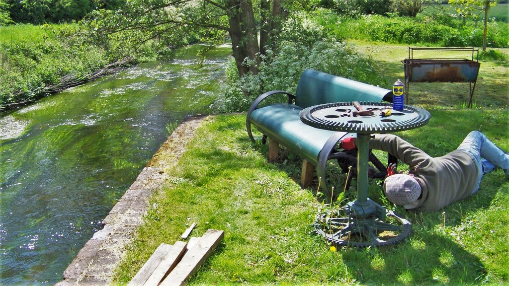 We cleared a small fallen tree blocking the footpath opposite the mill and Eddie mowed the grass along the footpath, around our bridge and sign, as well as round the bench, which Dennis has fitted new side tables to. We strimmed both sides of the river along the footpath and around the grindstones and seats.