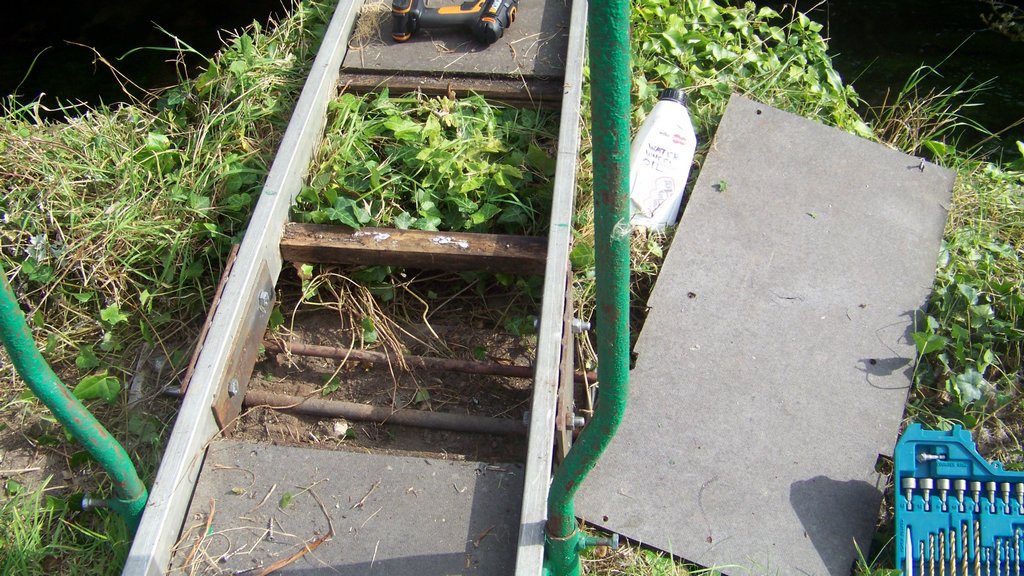 I cut away weeds in the river so the pintle in the river bed where the mitre gates closed can be seen, while working there I cleared brambles from the metal lock gate fittings. I made a laminated sign for the anchor strap found in the river so it can be displayed and an info board for the Blacksmith’s shop area. The footbridge was difficult to swing into position, so I removed the floor board over the bearing and saw the swivel was clogged with Ivy, I cut it all away which cured the problem.