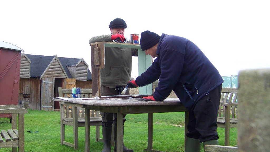 We cut more logs and put them in our log store, these are being used up as we have the fire alight in the wagon most working days. Eddie painted the table with wood treatment, this will need several more coats. Fred and Graeme went to the mill to survey and prepare for building the shed extension onto the visitor centre which is part of the wildflower meadow project.