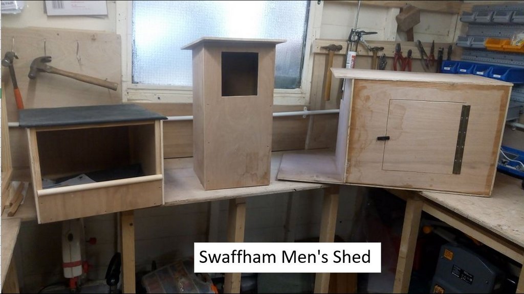 We fitted four bird nest boxes and a butterfly house in the trees around the site including an open fronted one for Pied Wagtails on the other side of the river. We visited Swaffham Men’s Shed to see the Owl and Kestrel boxes they are making which are nearly finished and look very impressive. Dennis has nearly finished the Sparrow terraces and sent a picture which looks really good. All nest boxes are for our Green Community Grant.