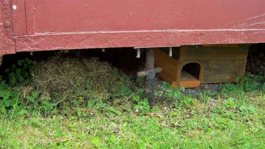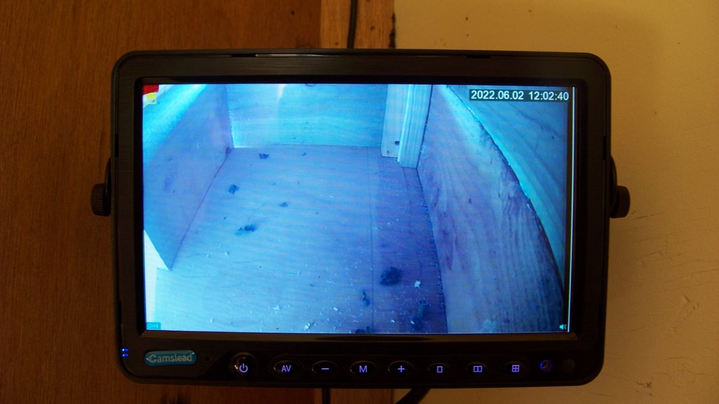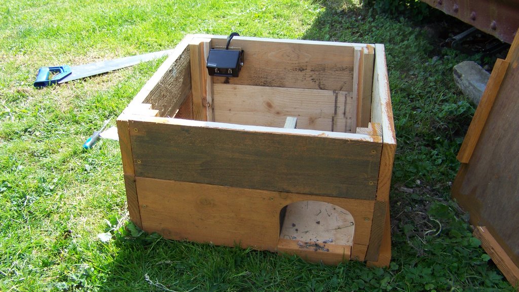 A bird nest box with camera needs to go on the visitor centre gable end, but access is difficult now the shed has been built. Fred suggested putting the nest box inside the building with a hole in the wall lined up with the nest box hole for bird access, so the box was modified to fit against the inside wall and will be fitted soon. UPDATE: this box was not used by birds so it was moved to a tree on the opposite bank where it was used by Great Tits, the camera was re-used in a Hedgehog box under the wagon.