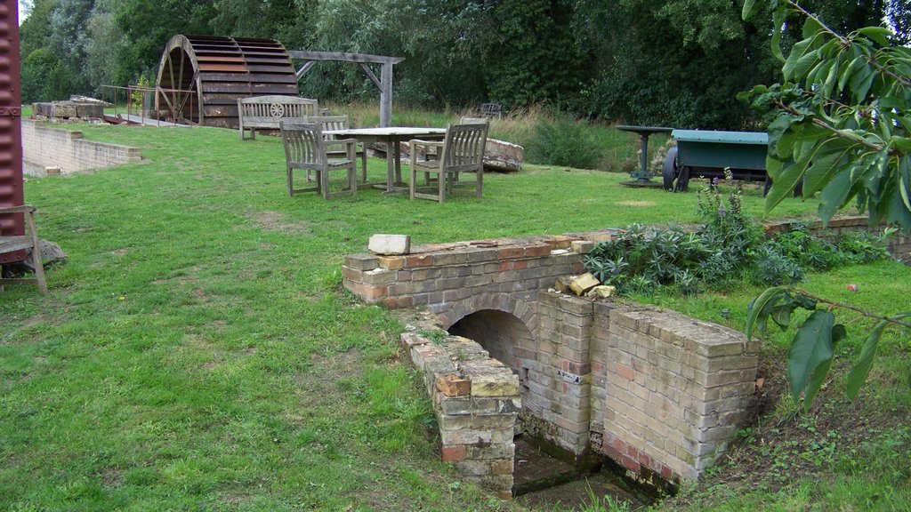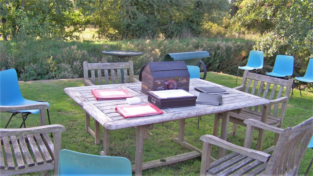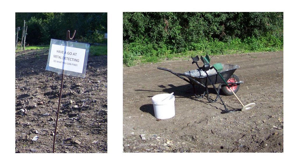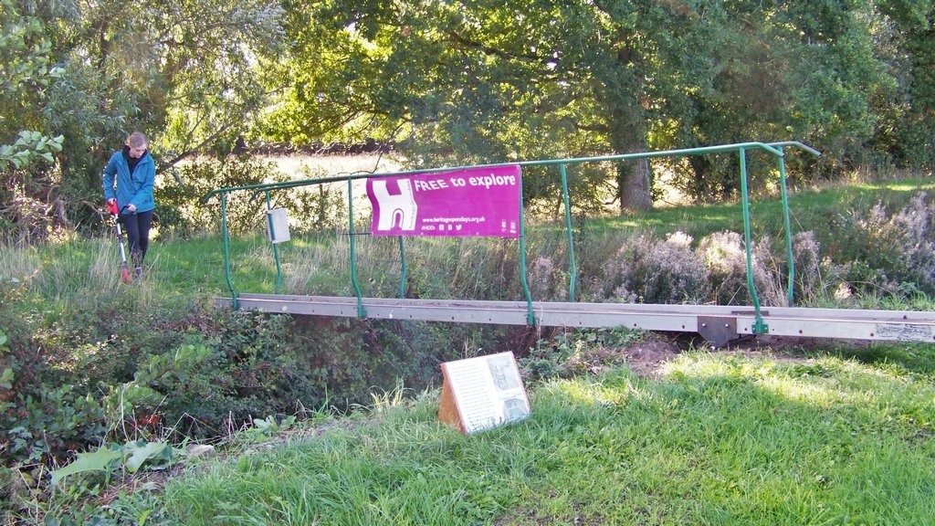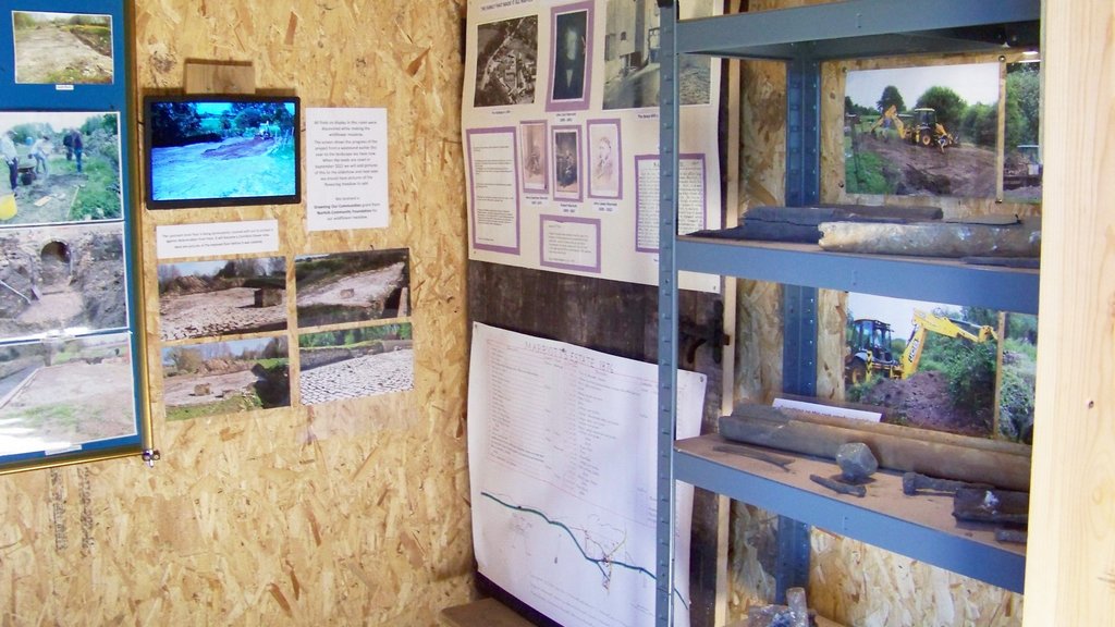 The pump was put in its containment tray and connected to the hoses, then started up which got the water wheel turning. The illuminated shelves and display screens in the visitor centre were switched on with slideshows of restoration work and making the wildflower meadow. Explanation signs were put out by the various features and Ryan set up the metal detecting demonstration with a sign, some buried metal objects and 3 metal detectors including his own.