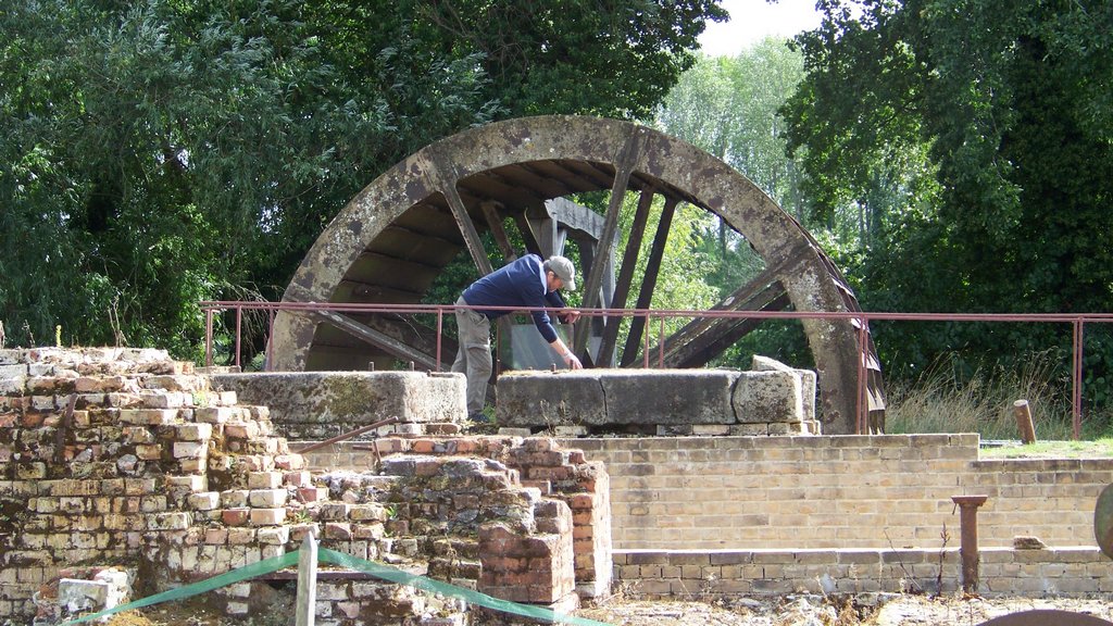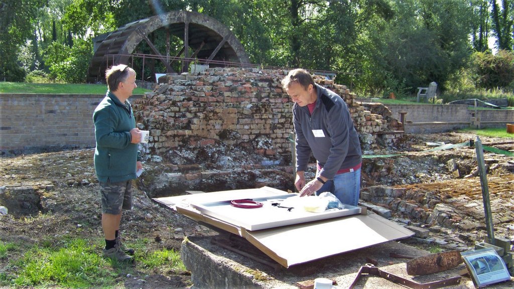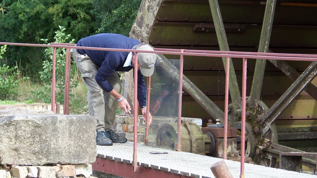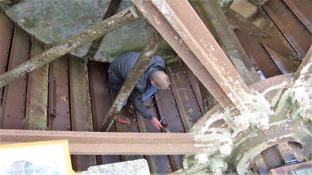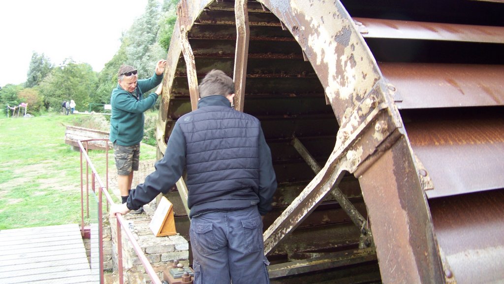 On Sunday afternoon when most visitors had gone, we marked the water wheel at the point where it slowed down, stopped the pump and re-positioned all the balance weights to try to prevent the wheel slowing down. It certainly had an effect on the balance, but needs more work to position the weights better. We discussed plans for removing the green container before winter as it has been replaced with a shed as part of the Wildflower Meadow project.