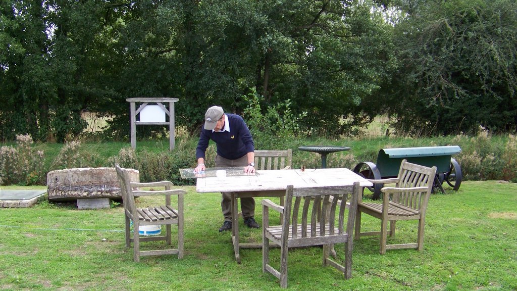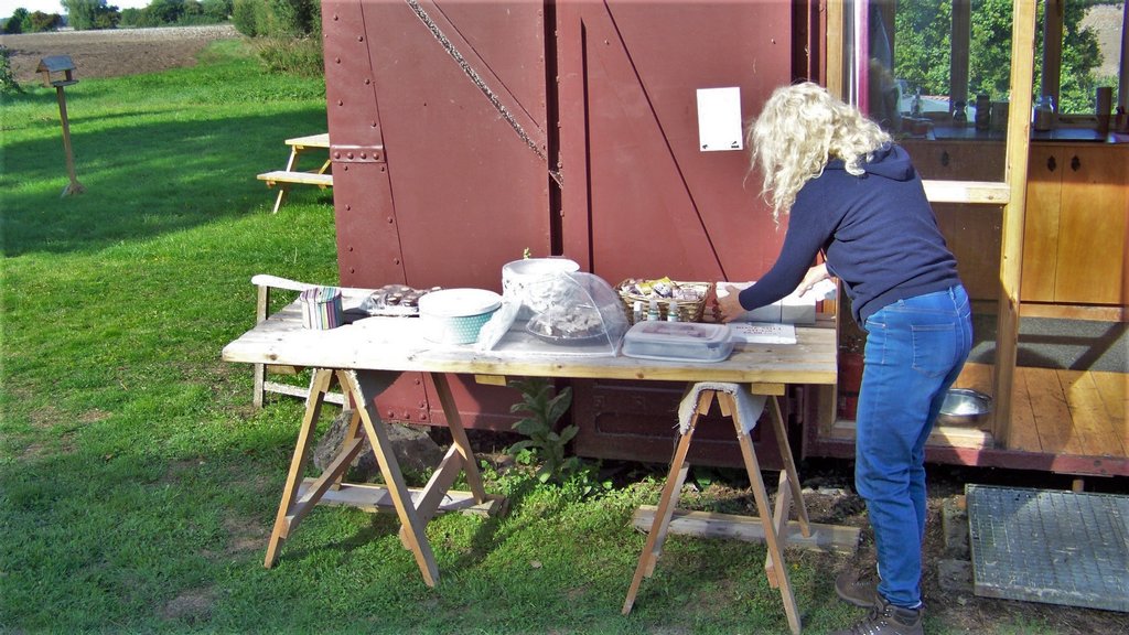 The old table top from our picnic bench was set up as a trestle table for the food. The picnic bench was moved near the wagon to allow our transport vehicles to turn round. Photo albums of restoration work were put on the large table with the donation box. Sack barrows and a surveyors chain were put on display outside the visitor centre, the model mill was displayed indoors on the replica grindstone.