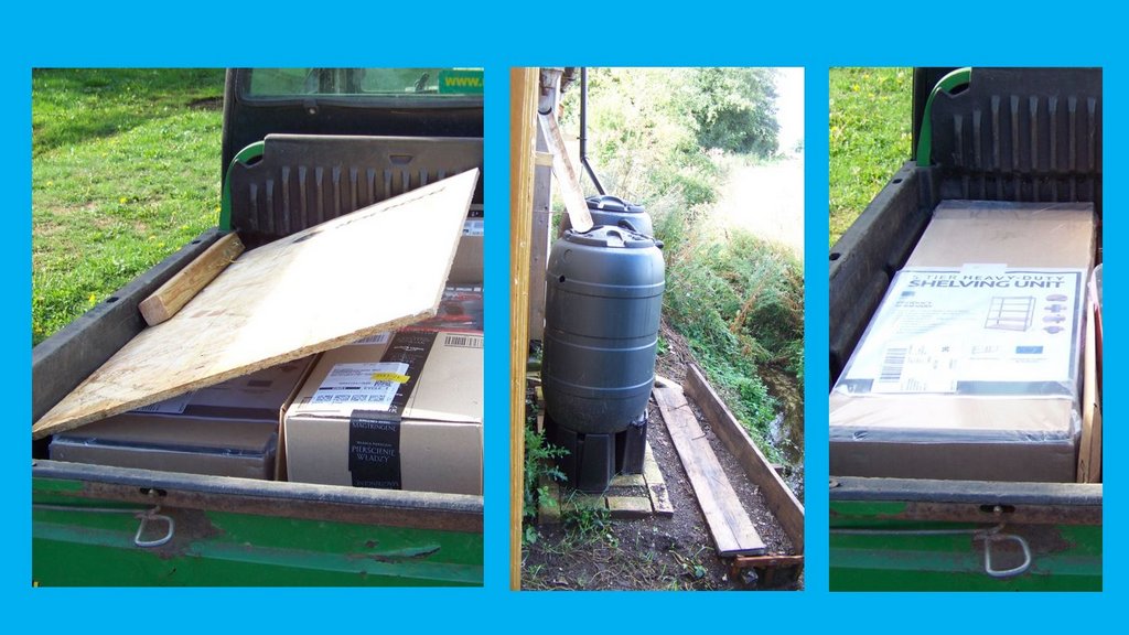THURSDAY 8/9/22 We had two more shelving racks delivered so we took them to the mill with some scrap wood we found at The Maltings for making signs. We had heavy rain recently so I checked the water butts, one is full, the other half full. I tested the walkway in front of them by walking along it and it feels solid and safe.