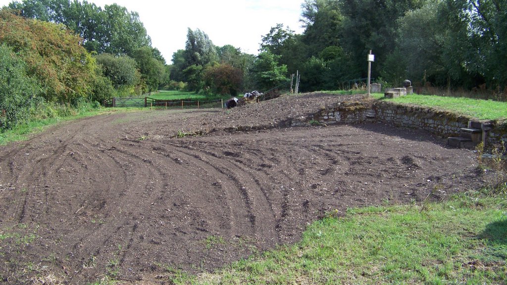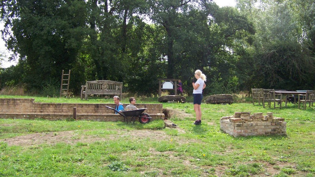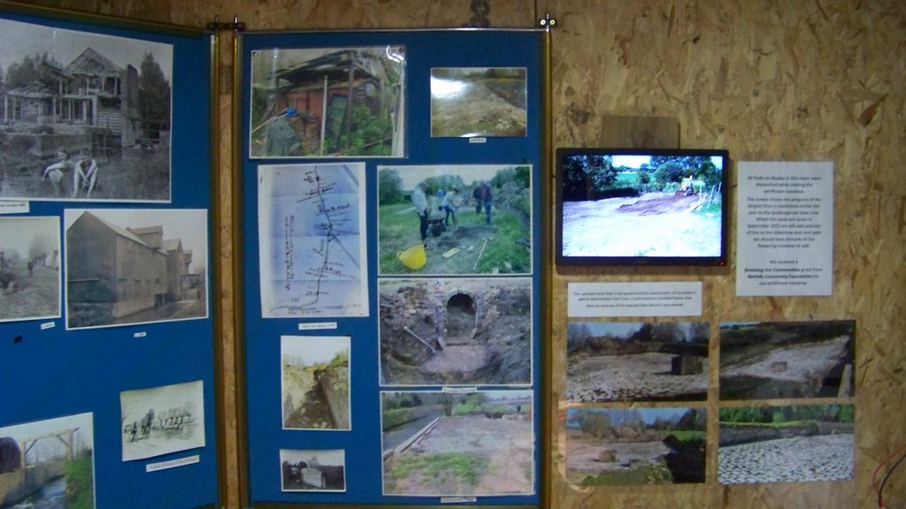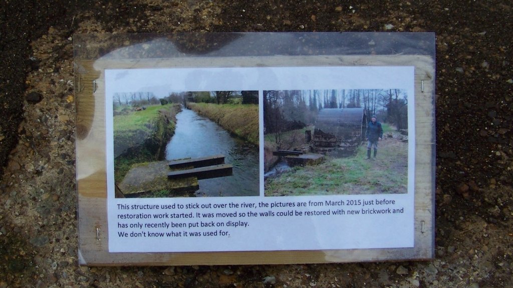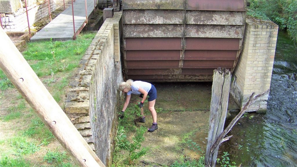 We viewed the brick floor which was covered with soil on Saturday, this will give a total wildflower area of 670 m2. We examined the concrete structure that was moved on Saturday, it was originally sticking out over the river, but was moved aside in 2015 and became lost in weeds. It’s now displayed next to the cistern. I laminated a sign with original pictures of it and stapled it to a board which I made ready for open days on 17 & 18 September. I put the fence back there to prevent visitors walking on the fragile cistern top.