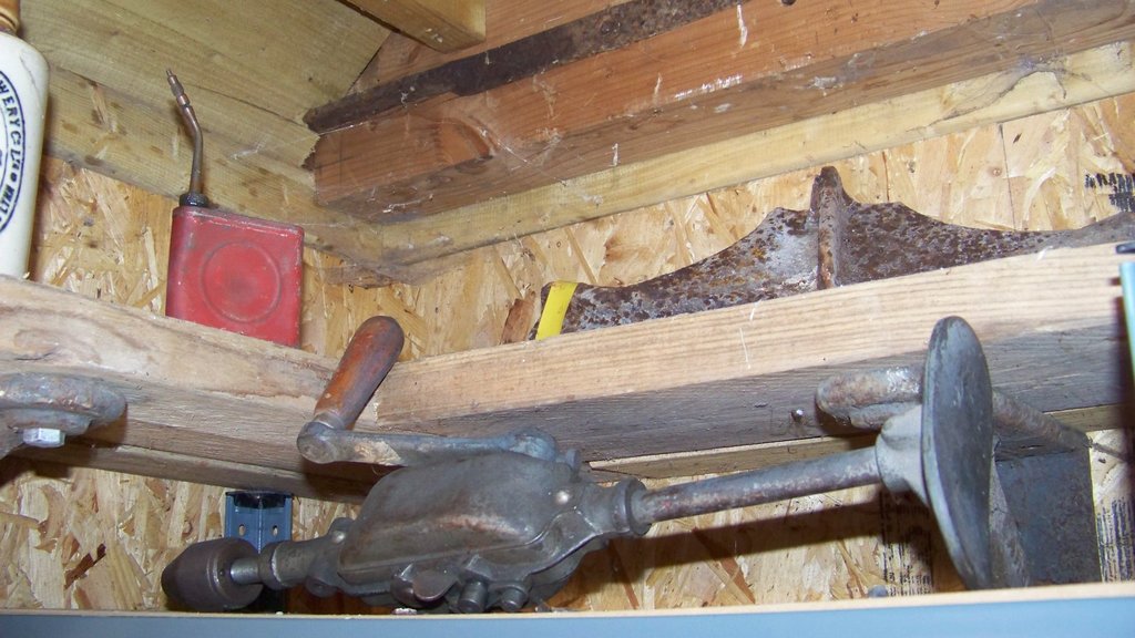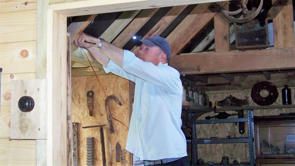 It started raining hard so we did some indoor jobs, I laid cables along the length of the visitor centre so we can power the illuminated shelves and display screens at both ends of the building for the open days. I had created a slideshow of making the wildflower area so I added it to the small screen and viewed it, Eddie spotted a spelling mistake on the caption, so I had to correct that. We put an oil can and hand drill from The Maltings on display, plus a two man saw which we made wooden blocks for, to hold it on to the wall.