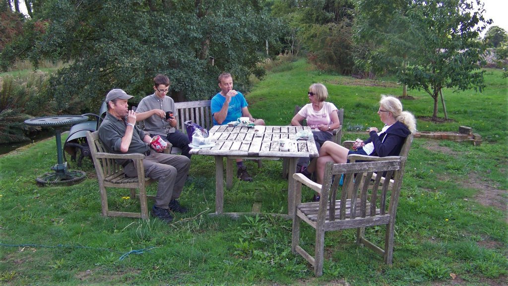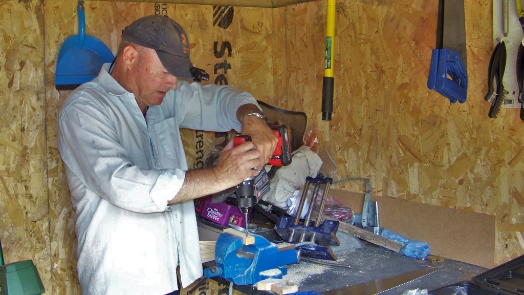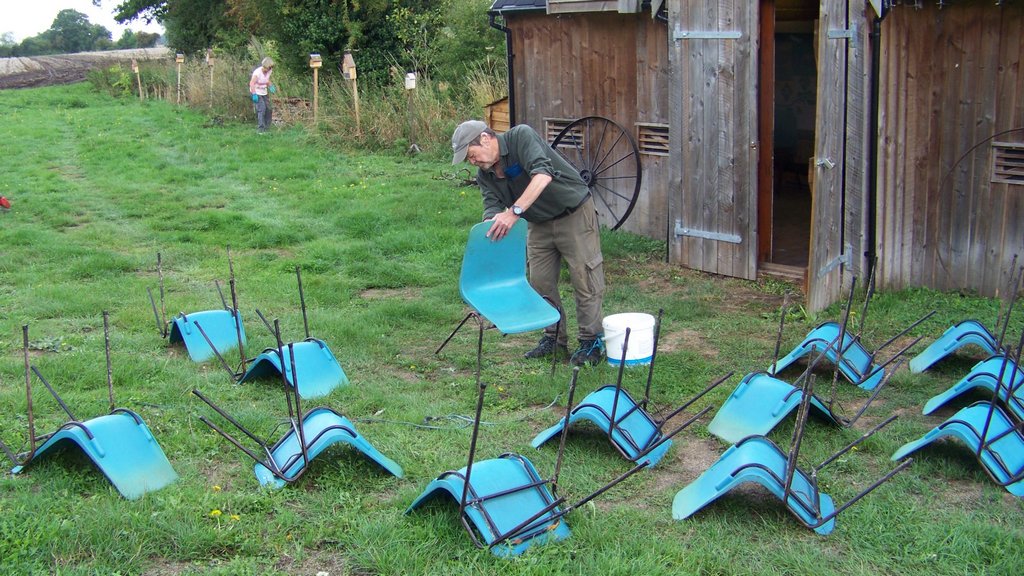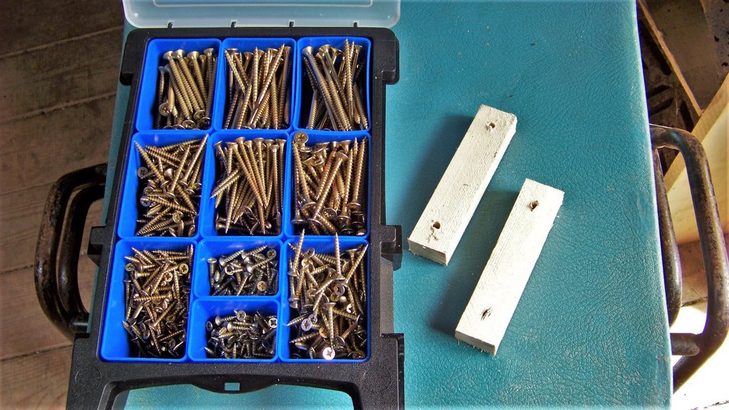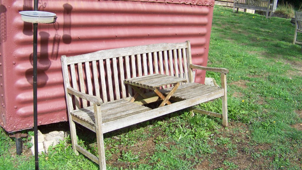 After the rain we tightened the loose coach bolts in the seat of the green bench using my dad’s spanners, then repaired the other bench as the folding table part had broken, we fitted a long woodscrew which has fixed it.